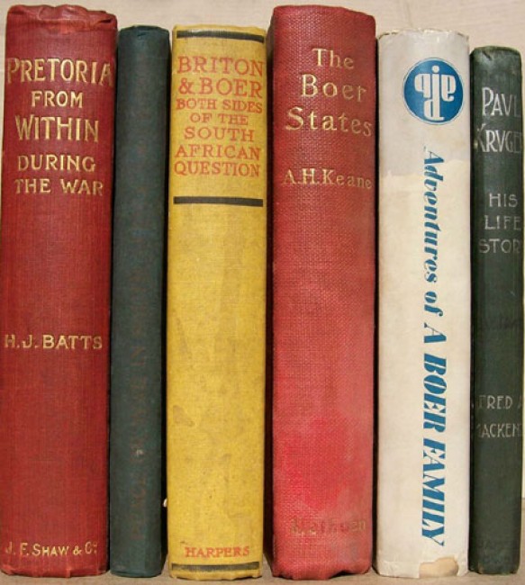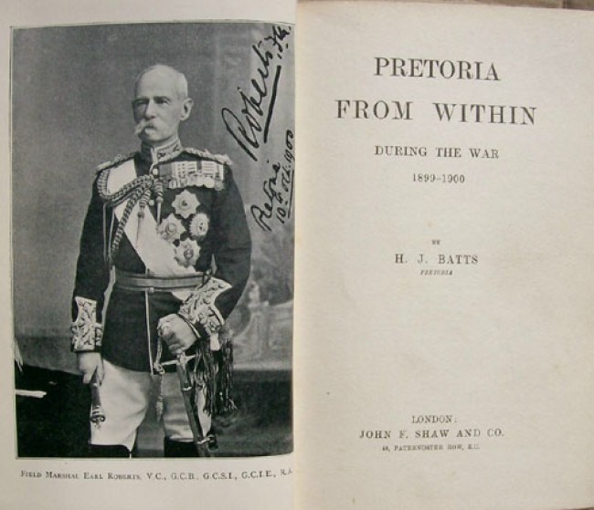 1) Batts, H.J. :\"Pretoria From Within During the War 1899-1900.\" Original red cloth boards with gilt titling on the spine and the upper board. Decorated light green end papers. viii prelims, 231 pages, 12 black and white illustrations including the frontis portrait of Field-Marshall Earl Roberts. 2 pages of the publisher\'s advertisements at the rear. First edition published in London by John F. Shaw and Co. A reasonable copy, but the hinges are starting to crack.
