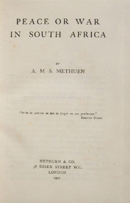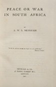 2) Methuen, A.M.S. : \"Peace or War in South Africa.\" Original paper covered boards with yellow titling on the upper board. viii prelims, 224 pages. First edition published in London by Methuen & Co., 1901. The end papers are browned.