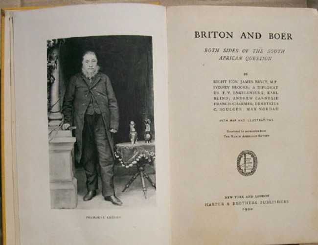3)This book was reprinted from articles that appeared the North American Review, 1899. Various authors including James Bryce, Sydney Brooks,Dr F.V. Engelenberg. Andrew Carnegie, etc.: \"Briton and Boer - Both Sides of the Bouth African Question.\" Original yellow cloth boards with red titling on the spine and the upper board with red and black pictorial decorations on the upper board. 7 prelims, 251 pages, a total of 18 black and white illustrations, coloured folding map at the rear, followed by 4 pages of the publisher\'s advertisements.
