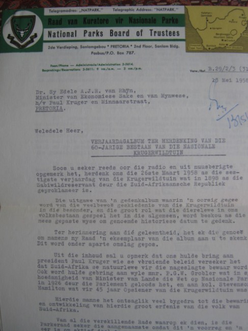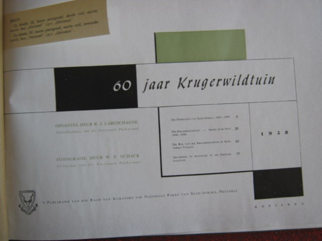 This book marked the 60th anniversary of the proclamation of the Sabi Game Reserve, the precursor of the Kruger, by the South African [Transvaal] Republic on 26 March 1898. This copy was presented to Dr A J R van Rhijn, Minister of Economic Affairs and Mining, and a two-page letter to this effect is loosely inserted in the book.