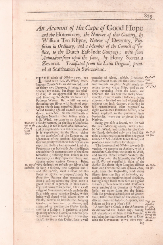 Mendelssohn (Sidney) South African Bibliography vol.2 page 470: Ten Rh}me visited the Cape in October 1673, and he gives an account of the natural features of the country in the neighbourhood of Table Bay. Very little is said about the settlement, its government, or the Dutch inhabitants, and the interest of the work centres in the description of the natural history, and an account of the Hottentots, the latter taking up the greater part of the volume.