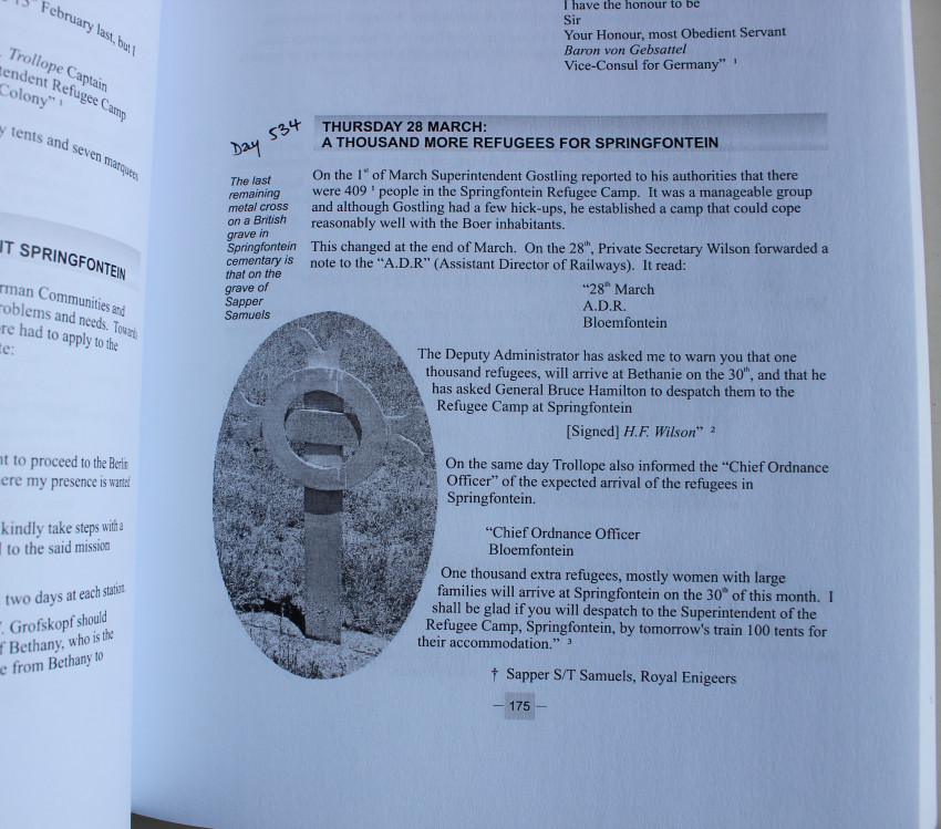 This valuable addition to Anglo-Boer War documentation covers 963 days at the Springfontein rail junction and records the dates and details of some one thousand deaths during this period in the concentration camps and elsewhere.