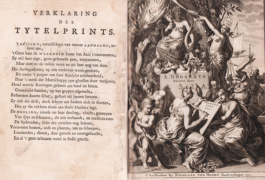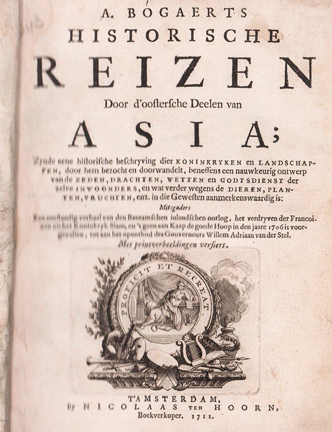 Mendelssohn (Sidney) South African Bibliography Volume 1 page 146: A. Bogaert's historical travels through the eastern part of Asia, including a descriptive account of the kingdoms and provinces visited and traversed by him, as well as an exact sketch of the manners, customs, laws, and religion of the inhabitants, and furthermore of the animals, plants, fruits, &c, which are remarkable in these regions. Together with a circumstantial account of the war in the interior of Bantam, the expulsion of the French from the kingdom of Siam, and what happened in the Cape of Good Hope in the year 1706 up to the time of the recall of the Governor William Adrian van der Stel. With plates.