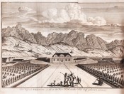 An account of Abraham Bogaert's third voyage to the Indies, at the outset of which he encountered a great storm, and his ship put into Plymouth. When the ship was ready for sea again, a fresh start was made, and passing the Canaries and Teneriffe, the vessel arrived in Table Bay in July 1702. There are descriptions of the country and the Hottentots, including a very curious plate. After a ten days' stay in Table Bay, the voyage was resumed to Bantam. Bogaert returned from the East Indies in the year 1706, calling again at Table Bay, and " he devoted two long chapters to an account of the tyranny practised by Governor William Adrian van der Stel, and its consequences. Of this he was more than a spectator, as he took an active part in the cause of the burghers. For this period of Cape history his work is of great value. ..." (Theal, " History of South Africa, 1481-1691.") There is the full text of the memorial sent home by the burghers complaining of the conduct of the Governor, and this memorial, according to Theal, was put into Bogaert's hands for safe custody, until the ship was fairly on its homeward voyage. No less than 138 pages of the volume are devoted to the account of Van Der Stel's case, and there is a view of Vergelegen, the Governor's estate, on which he had erected a large mansion. Amongst the engravings is a portrait of the author from a painting by Van Der Hess.
