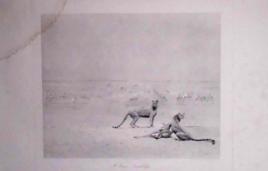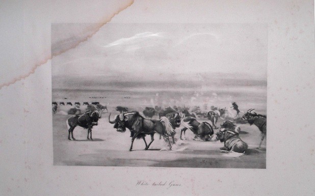 Folio size, original cream cloth, with pictorial design of antelope heads and title on front board, some fingering marking darkening lower corner as well some other marks on front cover, while the back cover displays a little age-marking.The book has been attractively recased and rebacked in brown calf. The condition of the textblock is good and bright for its age, however some damp staining has seeped through from the spine onto the inside corner of some of the plates, none to any great degree. The worst instance is illustrated in the photos below. The paper of the frontispiece has cracked just below the illustration, but is holding. The plates only, have light foxing throughout due to a different quality of paper used, and there are two plates of which one has a marginal tear just extending into the illustration, while the other has a piece of the margin missing. There is an ownership dated 1896 in ink on the prelims, endpapers have been replaced.