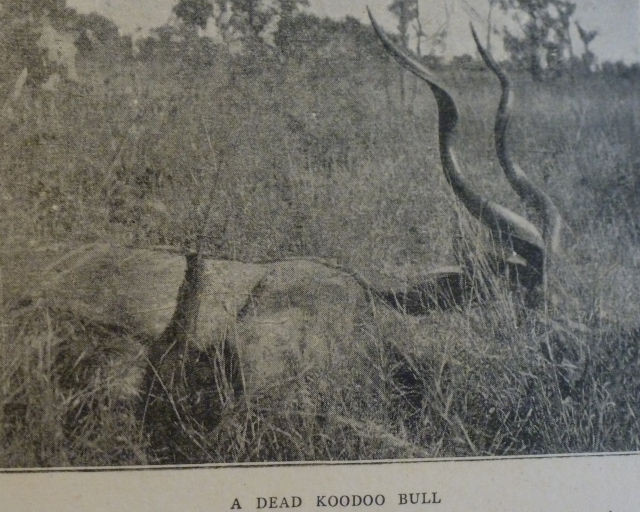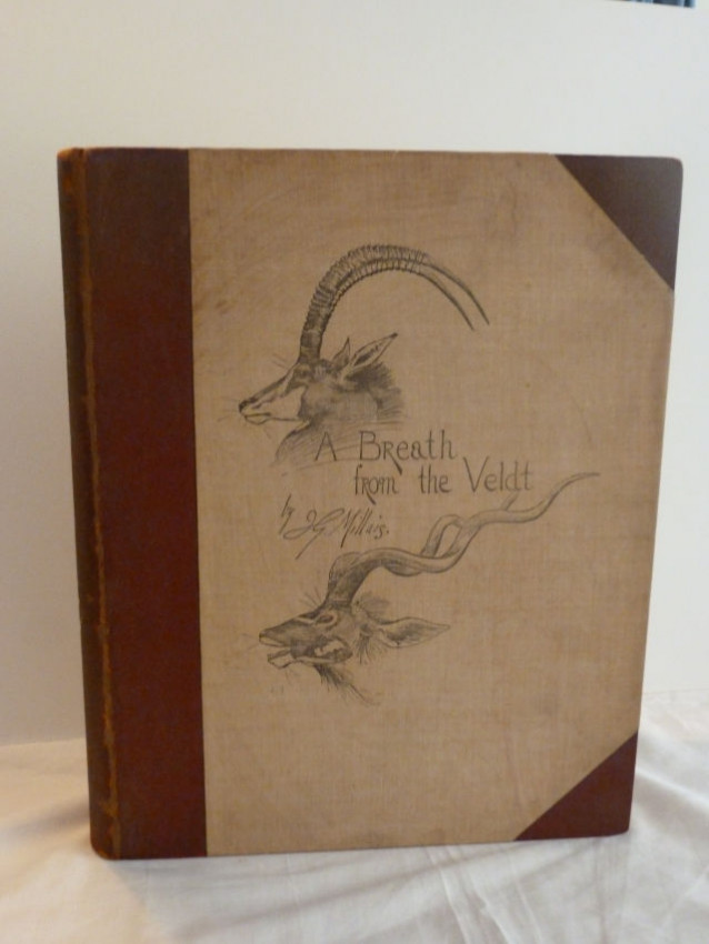 The cover has the title and author in gilt on the spine, and a frontal view of a Springbok’s head. The front is decorated with head of a Sable Antelope in profile and below with that of a Kudu.