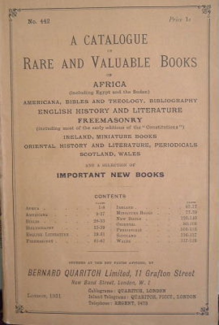 Full title: "A catalogue of rare and valuable books on Africa (including Egypt and the Sudan), Americana, bibles and theology, bibliography, Enlish history and literature, freemasonry (including most of the early editions of the "Constitution"), Ireland, miniature books, oriental history and literature, periodicals, Scotland, Wales and a selection of important new books." A fine bookseller's catalogue no. 442. Printer wrappers, pp. 140,(4). Consists of 1274 lots of old books plus many new books. 91 lots of Africana including Egypt