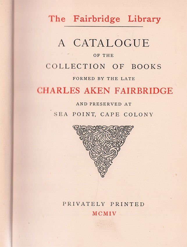 Fairbridge is probably best remembered for his life-long interest in books. In 1886 he and John Noble compiled a Catalogue of books relating to South Africa which was published in Cape Town for the Colonial and Indian Exhibition Committee. He started collecting books in 1851 and during the next four decades built up a magnificent collection of over 5000 titles, representing some 8400 volumes. It Included many rare items of Africana and was regarded as the finest private library in southern Africa up to the formation of the Mendelssohn collection. A catalogue of the contents was published in 1904. The library was purchased from Fairbridge's descendants by Sir Abe Bailey in 1926 and presented to the South African Library (now the National Library of South Africa, Cape Town campus).http://www.s2a3.org.za/bio/Biograph_final.php?serial=898