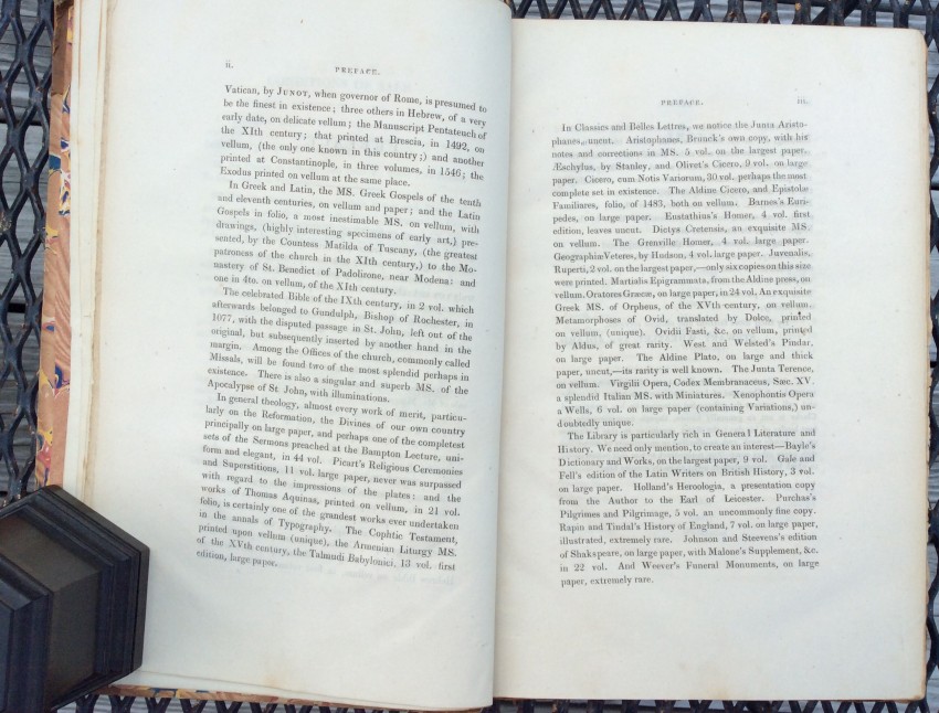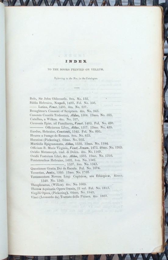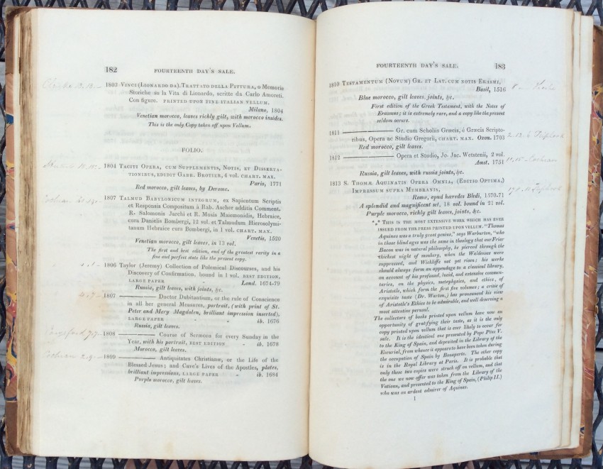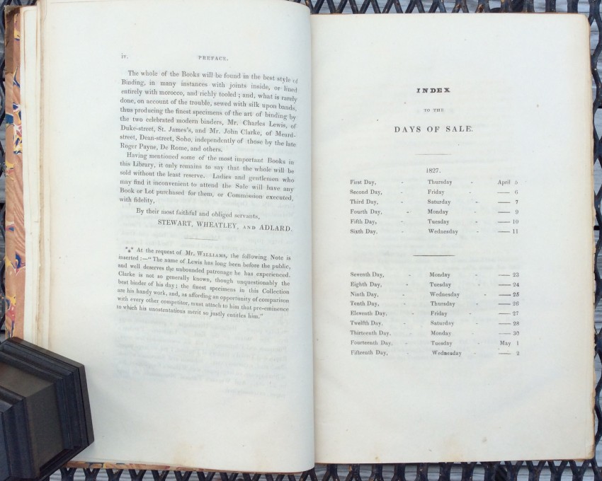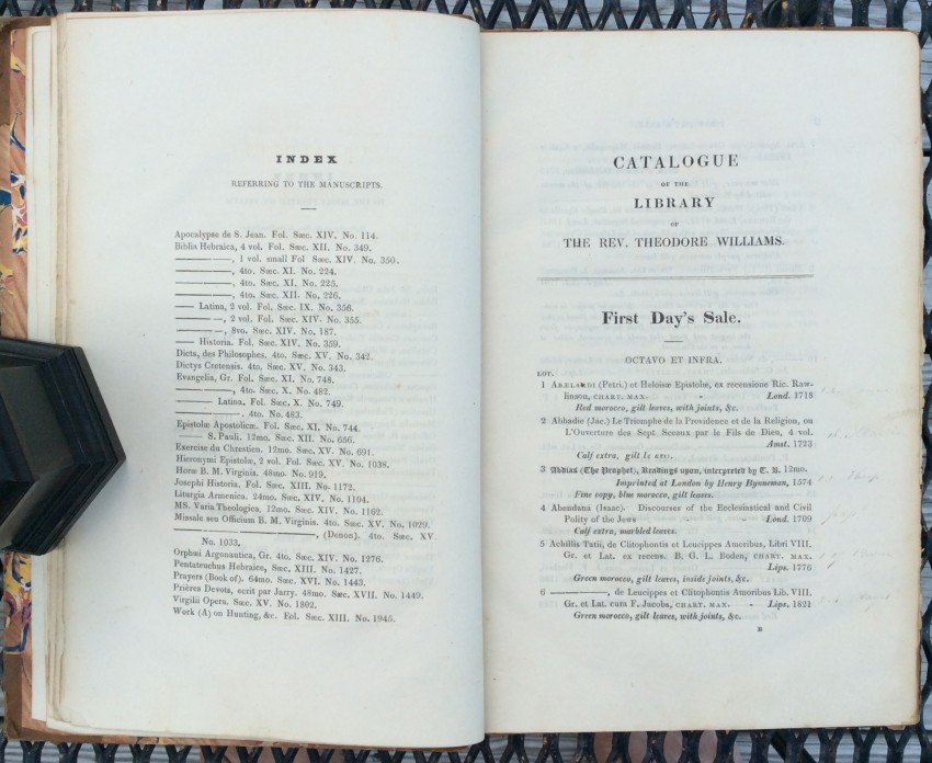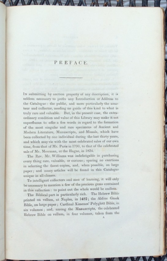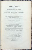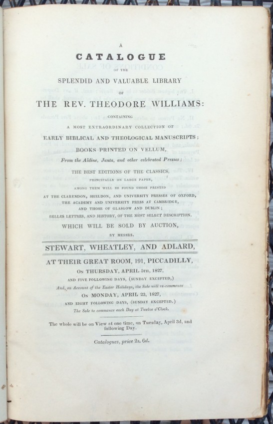 A Catalogue of the Splendid and Valuable Library of the Rev. Thodore Williams: containing a most extraordinary collection of early biblical and theological manuscripts; books printed on vellum, from the Aldine, Junta, and other celebrated presses; the best editions of the classics, principally on large paper ... belle lettres, and history, of the most select description. Which will be sold by auction by Messrs. Stewart, Wheatley, and Adlard, at their Great Room, 191, Piccadilly... [London: J. and C. Adlard, printers, 1827]. [bound with:] Books Omitted belonging to the Rev. Theodore Williams Library. [No place: 1827]