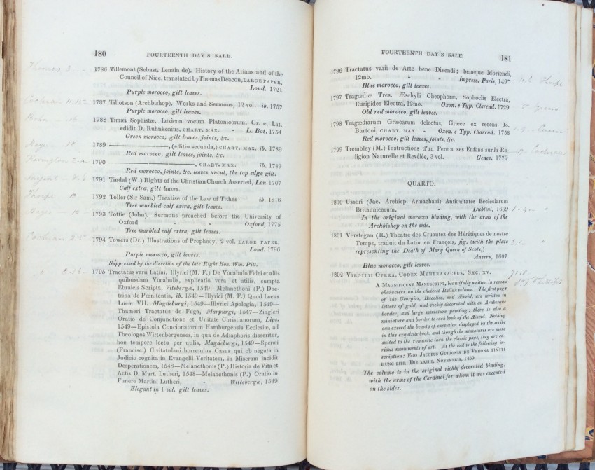 A provenance-rich copy of the Rev. Williams sale catalogue: Seymour de Ricci noted that the nearly all of "the handsome books and manuscripts" in the library "were bound in blue or green morocco [by Charles Lewis, and others] with the collector's crest ... Among the manuscripts were the Gospels of Mathilda of Tuscany [lot 749], which subsequently belonged to Sir Thomas Phillipps and are now in the Pierpont Morgan library" (English Collectors, pp.98-9). Williams also owned "Bishop Gundalf's celebrated Bible [lot 355] ... now in the H.E. Huntington Library" (ibid. p.122).