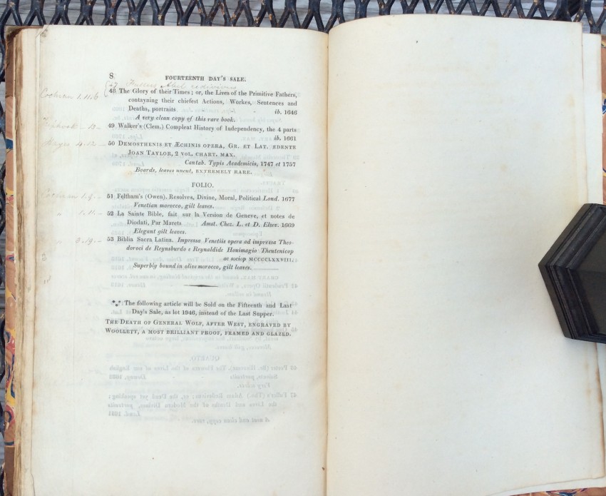 2 parts in one volume, octavo. Text listing 1948 lots in the main catalogue and a further 53 in the supplement, manuscript pricing and buyer's names throughout.