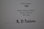 Half Maroon leather/marbled boards. Title in gilt on spine. Two small chips on raised boards on spine (See photograph) Original oatmeal slip case with marbled side and leather tips. No 172 of 200 copies named to R D Fulton. 21 colour plates.