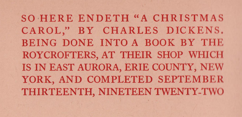 The colophon reads: So here endeth A Christmas Carol being done into a book by the Roycrofters at their shop which is in East Aurora, Erie County New York and completed September Thirtheenth, Nineteen Twenty Two.