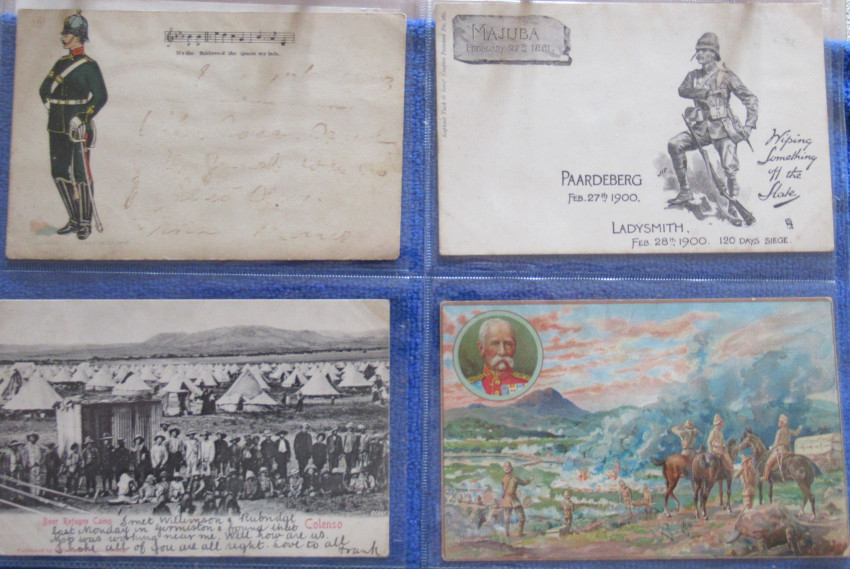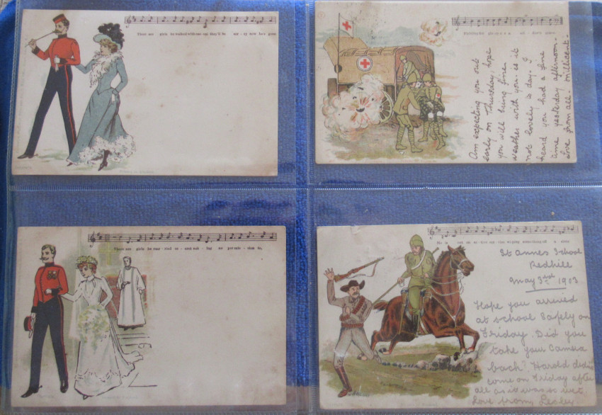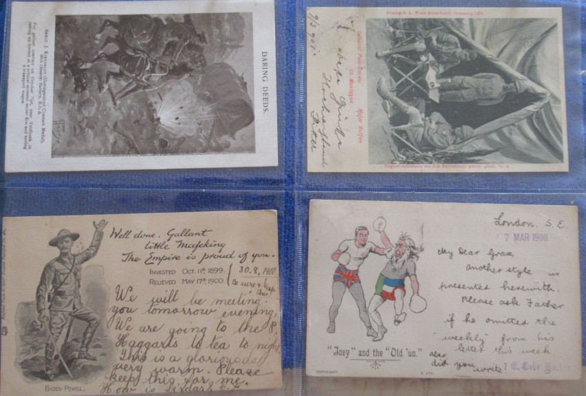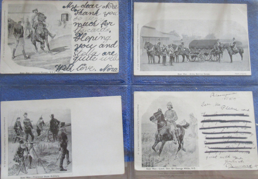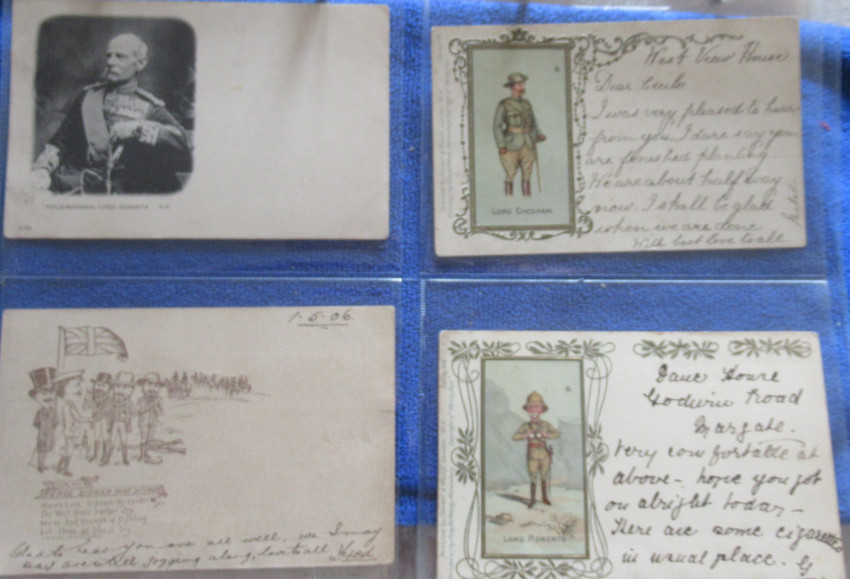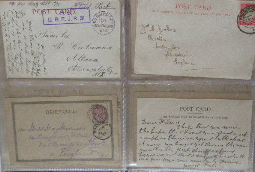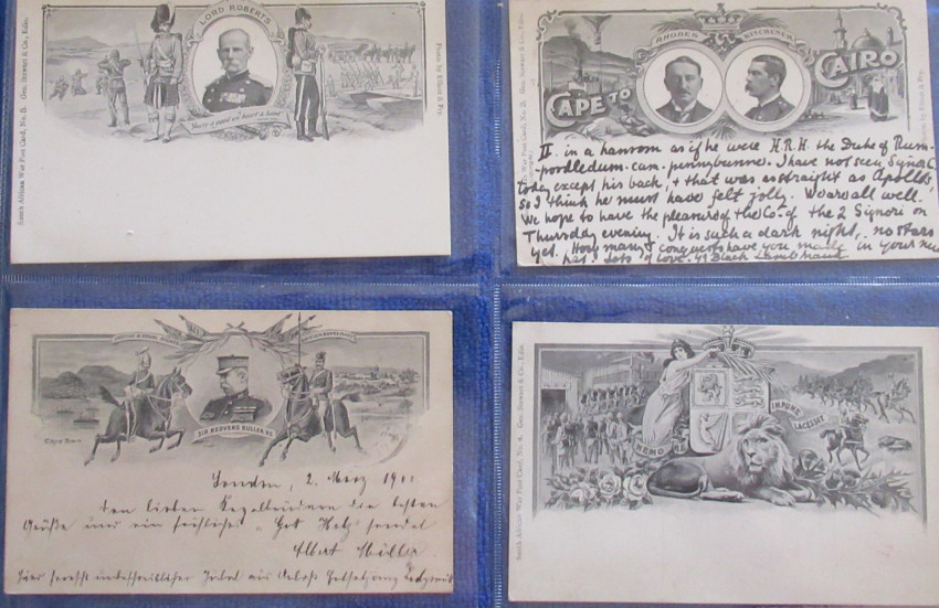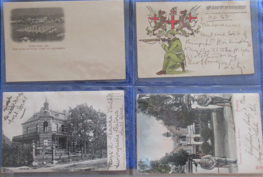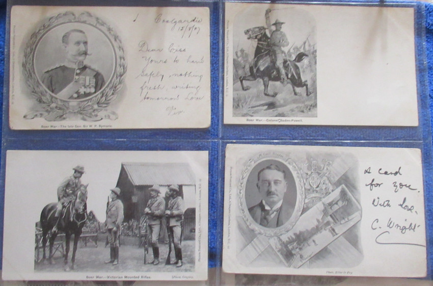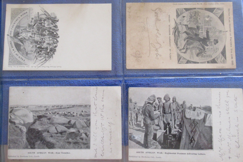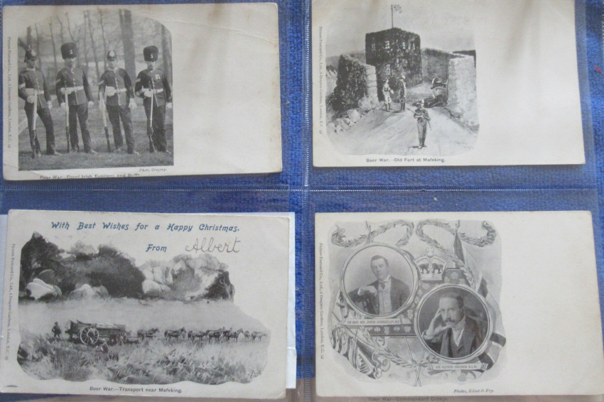 With inked messages and greetings, and from a large range of postcards, coloured and black and white examples. Includes examples from concentration camps, Ladysmith, Mafeking. Also includes examples of humourous cards, South African War Cards from a variety of manufacturers. Includes some foreign cards.
