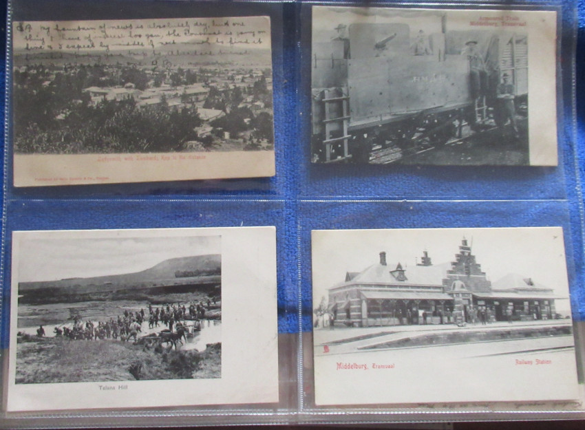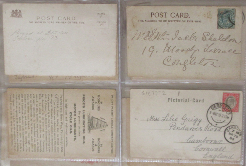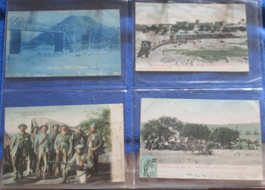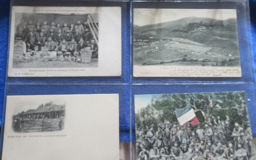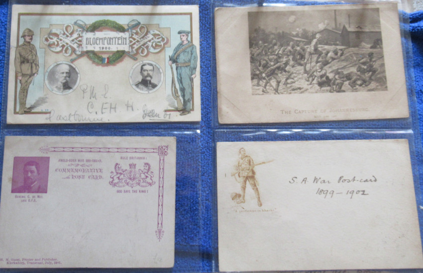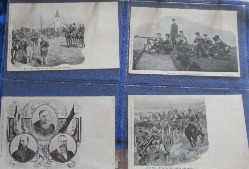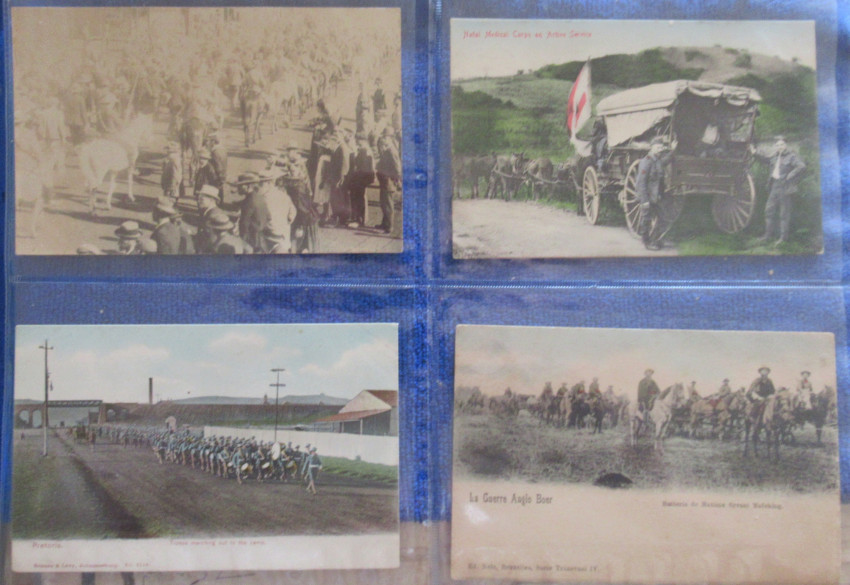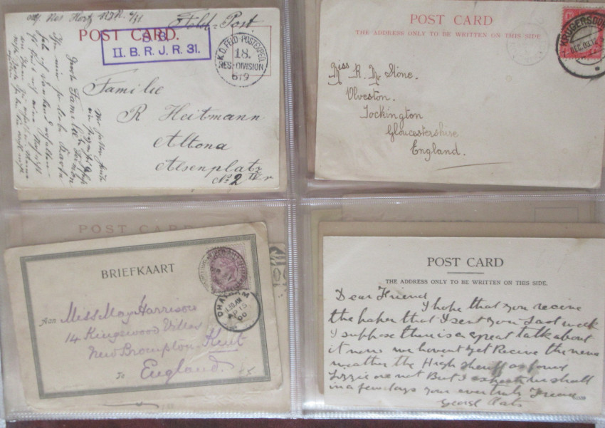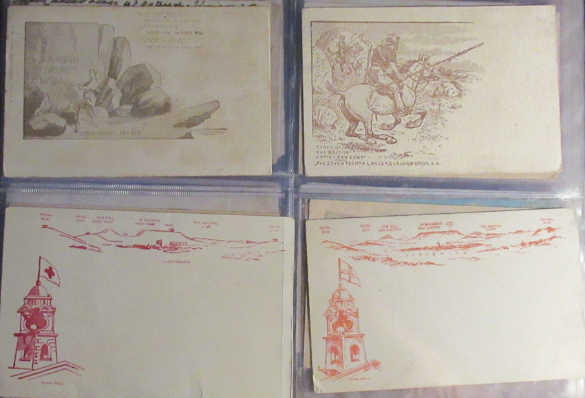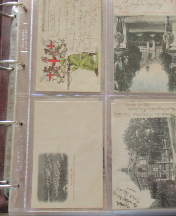 With inked messages and greetings, and from a large range of postcards, coloured and black and white examples. Includes examples from concentration camps, Ladysmith, Mafeking. Also includes examples of humourous cards, South African War Cards from a variety of manufacturers. Includes some foreign cards.