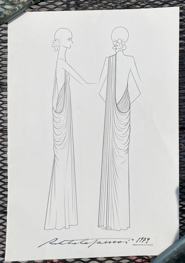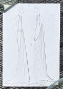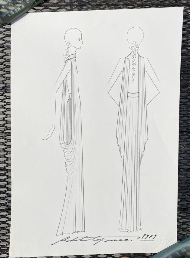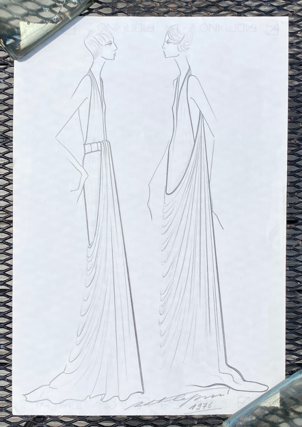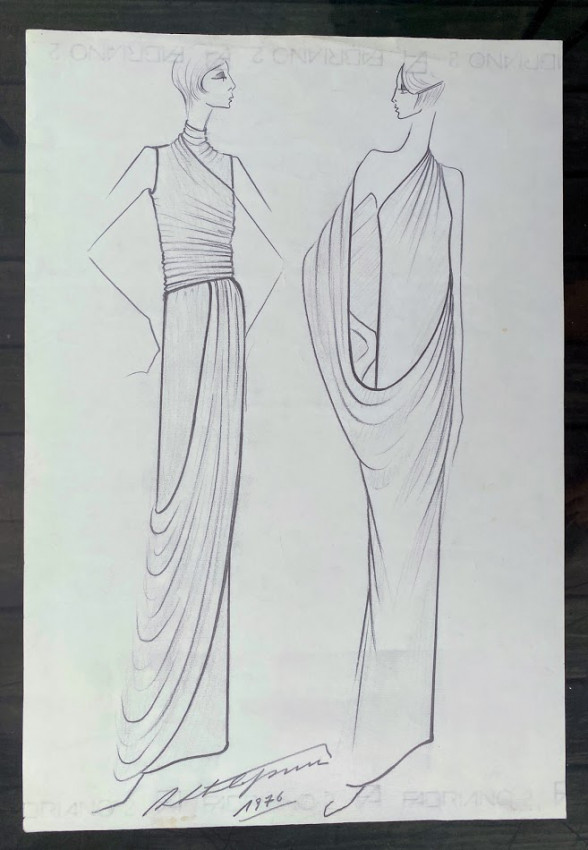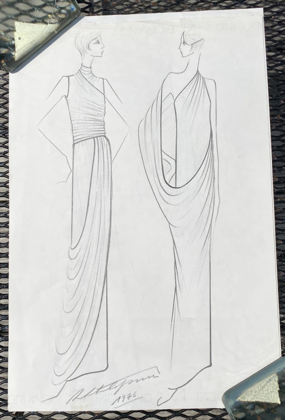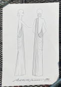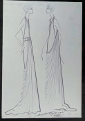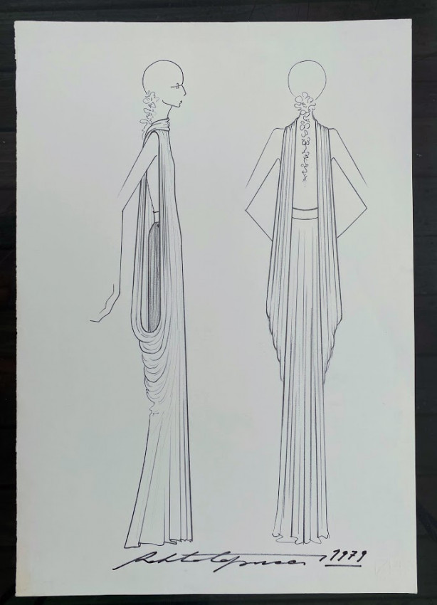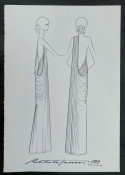 [A collection of 4 original monochrome fashion designs (lot A]), pen, ink and pencil, all signed and dated, 1976 & 1979. The earlier pair on Fabriano wove paper (19 x 13ins; 483 x 330mm), the later pair on thick Fabriano wove paper (19 3/4 x 13 3/4 ins; 502 x 350mm).