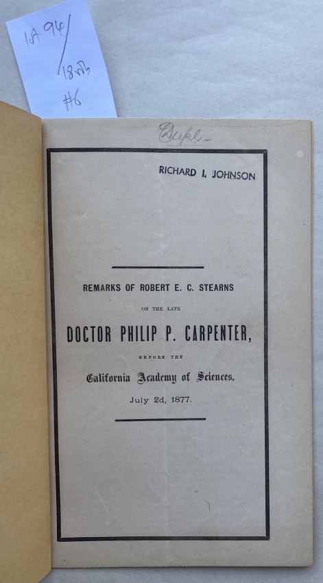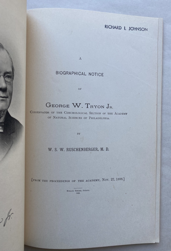3.W.S.W. RUSCHENBERGER. A Biographical Notice of George W. Tryon … from the proceedings of the Academy. Philadelphia: 1888. Octavo. Portrait frontispiece. Original grey wrappers.