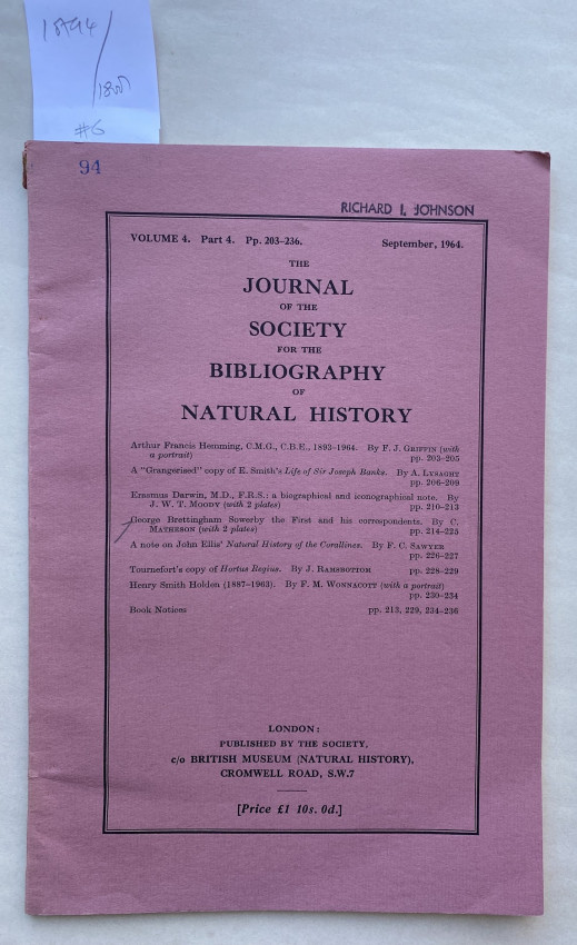 1.Jonas COLLIN. Konchyliologen Otto Andreas Lowson Morch. En biografisk Skizze. Copenhagen: 1878. Octavo. Portrait frontispiece. Grey paper wrappeers, stapled. Provenance: Dr Edwin Linton (1855-1939, author’s presentation inscription).