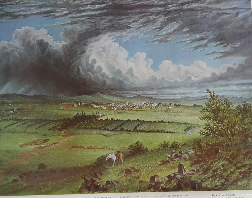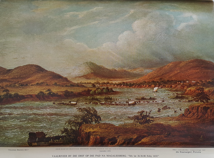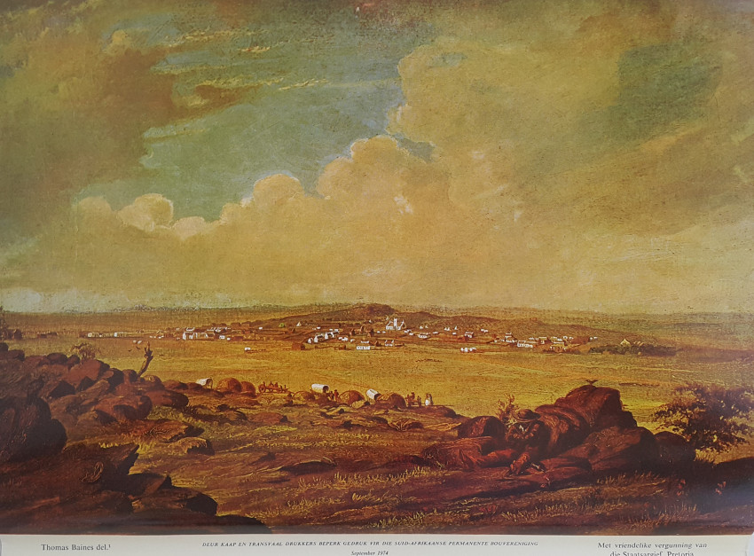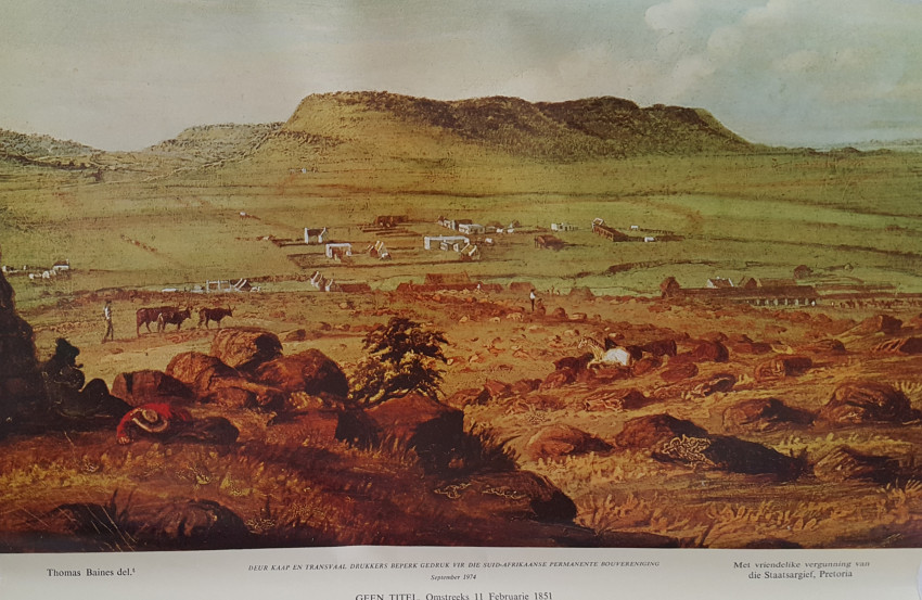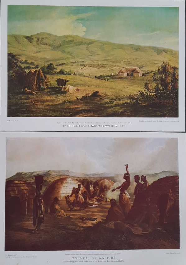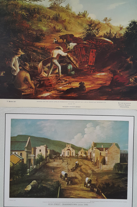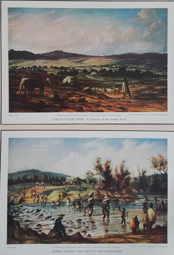 Thomas Baines was born in Kings Lynn, England, in 1820. He came to South Africa in 1842 as a trained ornamental painter. His work is distinguished by its accuracy. Baines was an official War Artist in the eighth Frontier War and later was Artist to Livingstone's expedition to the Zambesi. He visited the Victoria Falls and made a trip to visit Lobengula.