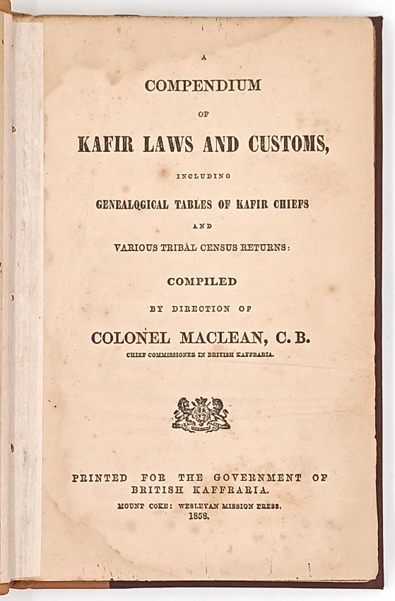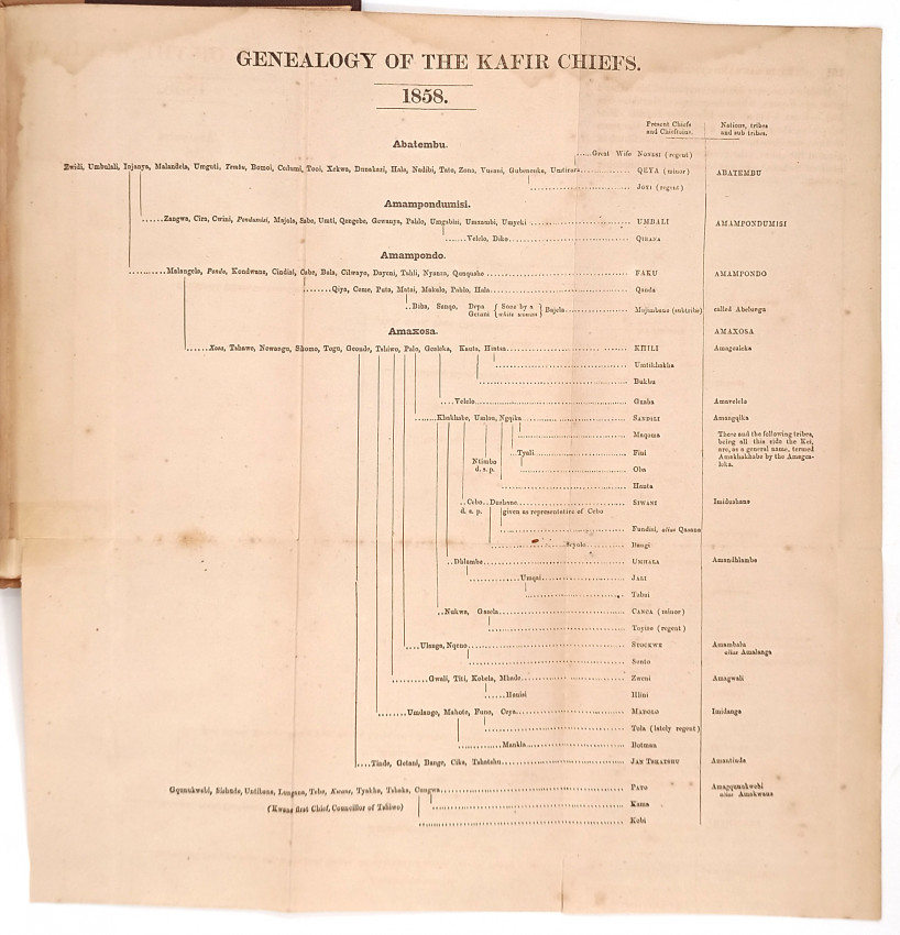 Mendelssohn (Sidney) South African Bibliography volume 1 page 960: This volume, the results of the author's efforts to form a compilation of facts concerning the native races, is regarded as one of the best in the subject, and contains many valuable papers by the Rev. H. H. Dugmore, and Messrs. Warner, Brownlee, and Ayliff. The geography, government, laws, and customs of the natives are fully described, and the mass of information thus presented is extremely useful to students of the habits of the aborigines of South Africa. The genealogical tables assist in explaining the somewhat complex system of the Kaffir laws of inheritance and descent, and a census of British Kaffraria in 1857 is appended.
