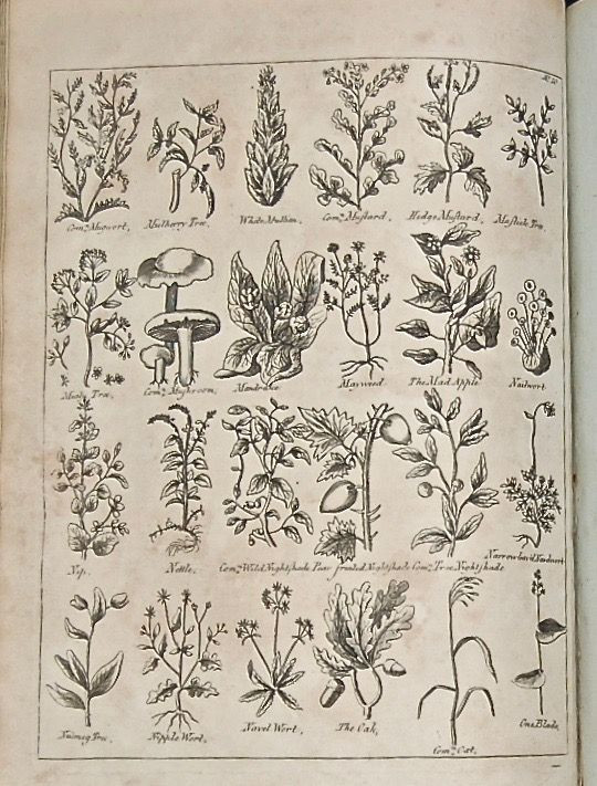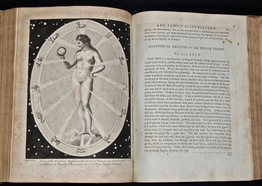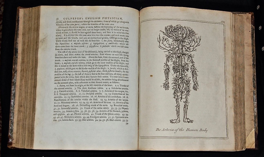 Nicholas Culpeper and Ebenezer Sibly. Culpeper’s English Physician; and Complete Herbal. To which Are Now First Added Upwards of One Hundred additional Herbs, with a Display of Their Medicinal and Occult Properties. London: E. Sibly, c.1794. Two volumes in one (xvi, 398 pp.; 256 pp., index); frontis (Culpeper) and 29 b&w botanical plates (misnumbered but in correct order); two b&w plates (‘celestial influxes’), eleven b&w plates of physiology, etc. (nos. 30- 40). Dating this edition partly based on date of dedication to Thomas Dunckerly, Provincial Grand Master of Free Masons, i.e., Year of Masonry 5798 (or 1794). Sibly’s editions of Culpeper’s herbal sought to retain the connection between medicine and the occult which traditional herbal remedies, based as they were on apparent and imagined properties of plants, seemed to provide. Quarto in contemporary leather and marbled paper covered boards (worn), gilt lettering and decoration to spine; expertly repaired spine, replaced endpapers; frontis margin chipped at top corner, mild damp stain to margins. The account of the properties of coffee (Culpeper’s dating from the mid-seventeenth century) suggests Sibly did not up-date the text of the herbal: ‘This is reported to be the berries of certain shrubs or bushes grown in Arabia.... It is said of itself to be insipid, having neither scent nor taste; but being pounded and baked, as they do prepare it to make the coffee-liquor with, it then stinks most loathsomely, which is an argument for some Saturnine quality in it: the propugners for this filthy drink affirm that it causes watchfulness...they also say it makes them sober when they are drunk....’ But, then, perhaps Sibly didn’t like coffee. A pleasing copy with a bright text on blue-tinted paper and largely clear plates (small hole in corner of plt. 2).