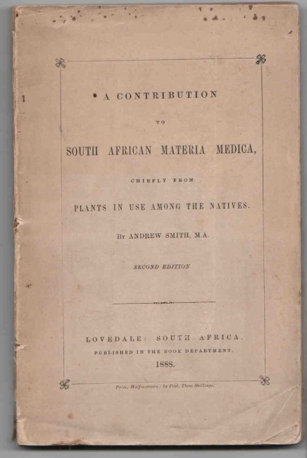 217 x 140 mm; printed wrappers; pp. viii + [5] -163 + (i). SABIB confirms that the page numbering, following the preliminaries, starts at page five. Wrappers fragile, curled, and a bit soiled; backstrip fragmented; fox spots throughout, especially to edges. (SABIB 4, p. 230; Mendelssohn II, p. 325 [3rd edition]) \'The plants described in this volume are stated to have \"been in use among the natives for medicinal purposes for a very long period. Some of them are well known, others are known only to a few, who keep the knowledge of their virtues to themselves with profound secrecy, and occasionally mislead people by showing other plants, or ascribing to a plant some use very different from its real one.\"\' - Mendelssohn. Early work on South African indigenous medicine.