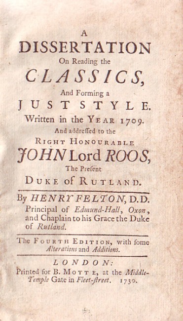 A treatise by the English clergyman Henry Felton (1679-1740), addressed to a young nobleman, John Roos, the future Duke of Rutland, on the cultural and literary affairs of society, emphasizing the importance of understanding the Latin classics.Much of this popular little book is devoted to the author\'s theories of education in general, and the art of teaching in particular, as well as rhetoric and literary style. There are also remarks on such contemporary writers as Swift (his favorite), Addison, Dryden, Prior, Milton, Otway, Cowley, and Denham. 243 pp, in original panelled calf binding, some age-toning on textblock, cypher on eps, hinges have been repaired nicely with archival tape.