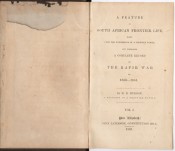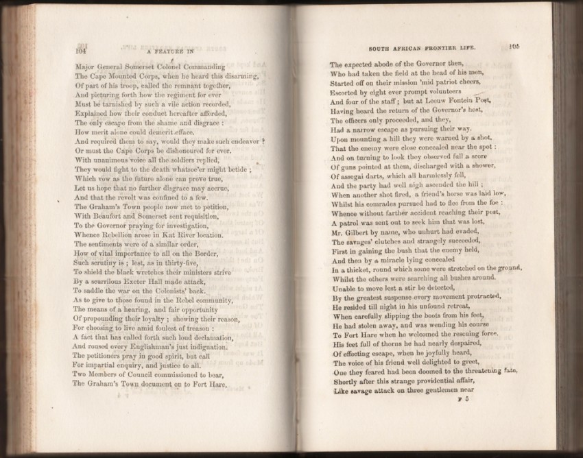 Mendelssohn (Sidney) South African Bibliography, volume 1, page 744, ‘The account of the Kaffir War is in the form of a long poem consisting of 202 pages, and of the minor pieces, Fragment I. is entitled “Bachelor's Life on a Sheep Farm”; Fragment II. “On Choosing a Wife. A Sequel to Bachelor's Life”; Fragment III. “A Batchelor's Soliloquy, or A Dream of Married Life.” There are a number of notes to “A Feature in South African Frontier Life,” which give considerable information regarding the Eastern Province and Kaffraria.