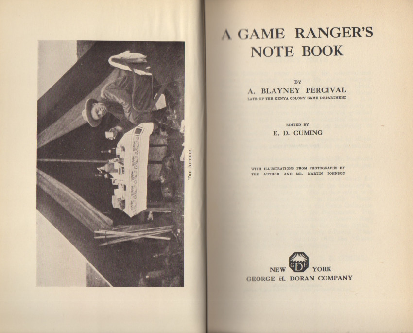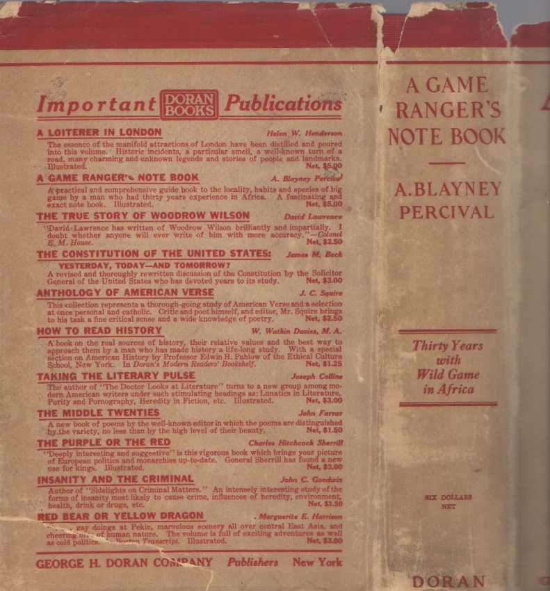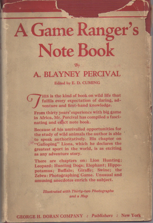 Percival spent thirty years in Africa, much of it as a member of the Kenya Colony Game Department. This book reflects his vast knowledge of the game and its habitat, with important descriptions of the terrain and numerous hunting adventures. The various species of Kenyan game are presented in chapters, and includes lion (7 chapters); leopard and cheetah; elephant (2); rhinoceros (2); hippo; buffalo (2); as well as chapters on plains game. Original embossed red cloth with bright gilt spine titles. Small bump to upper corner of front cover. Original endpapers firm and tight. Well illustrated with photo plates and large folding map. The scarce dust jacket is lacking a strip across the top of the front panel, but not affecting the titles. There is chipping to the top edge of the spine panel, a sealed tear to the lower corner of the rear panel, and normal handling wear.