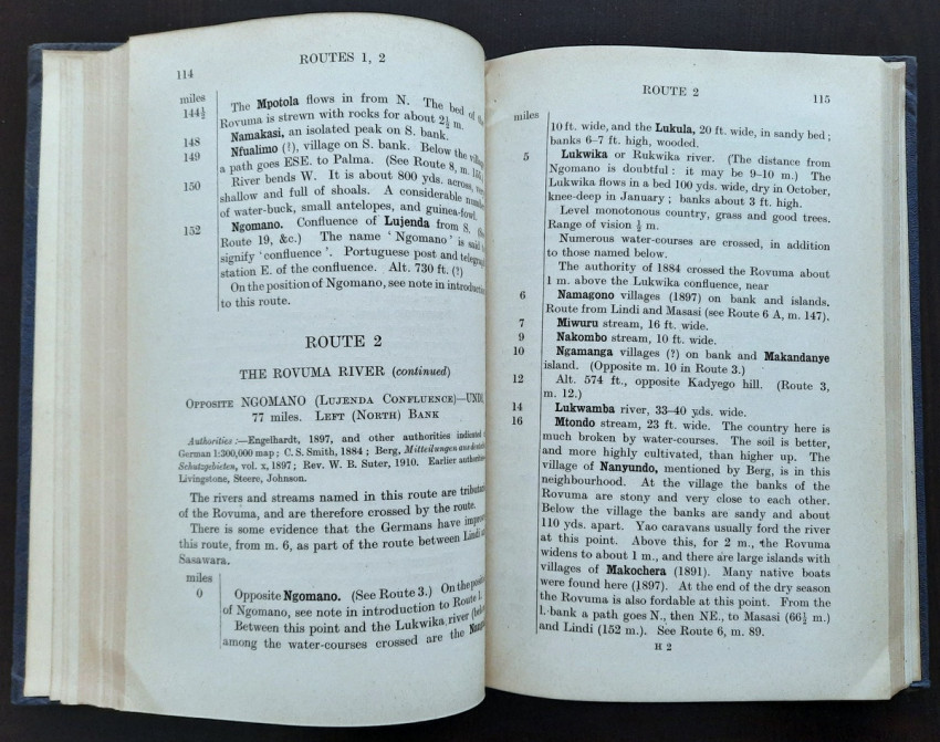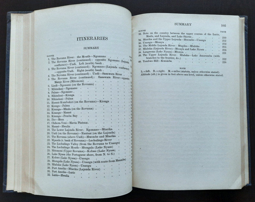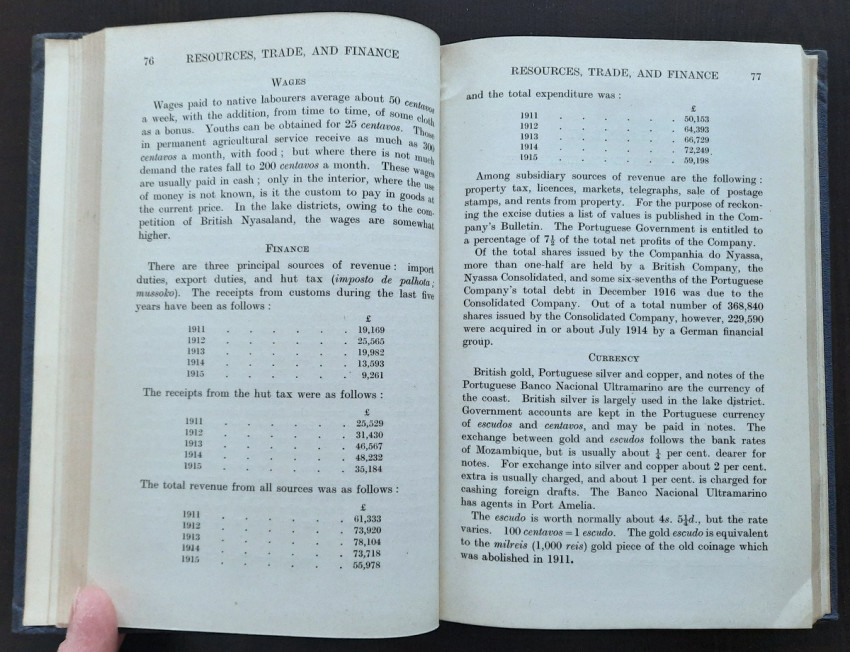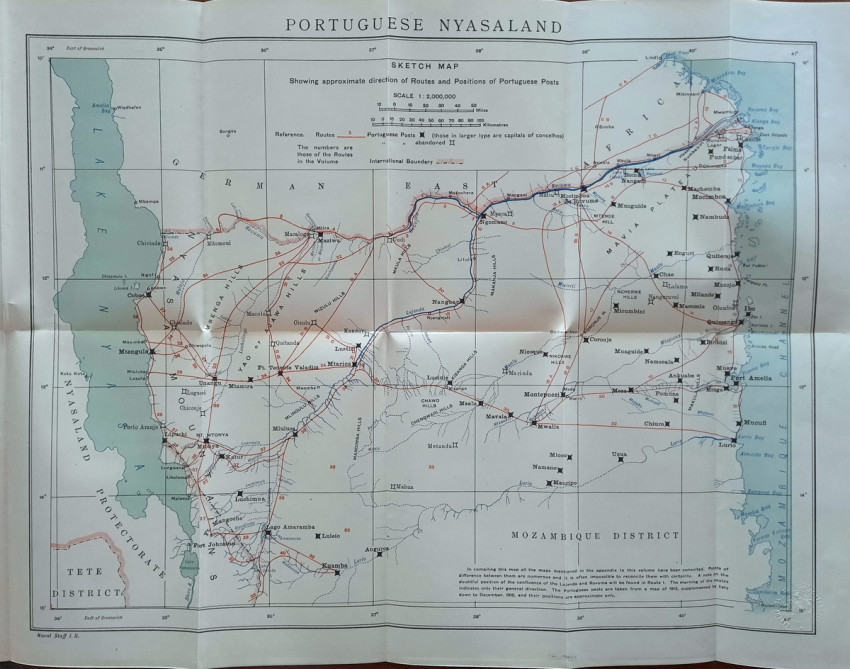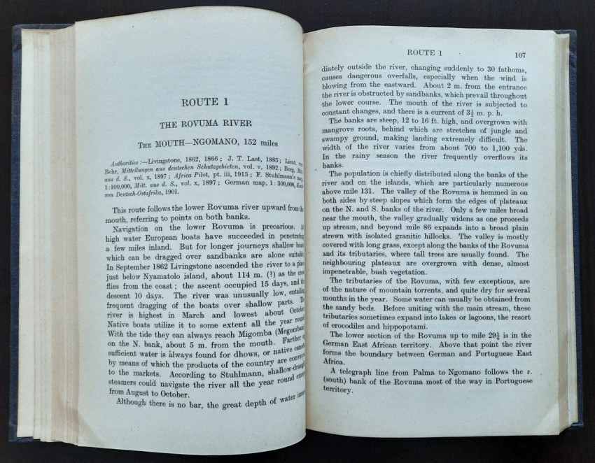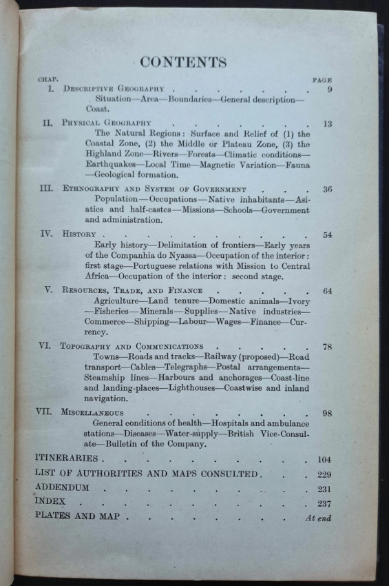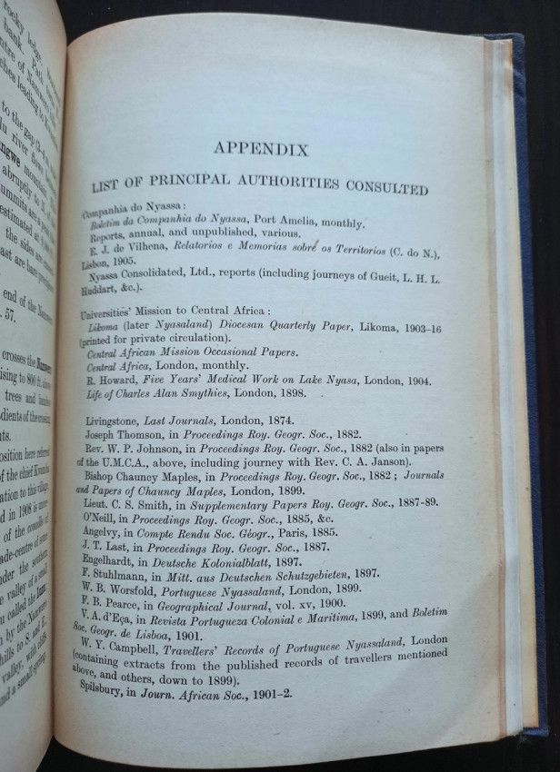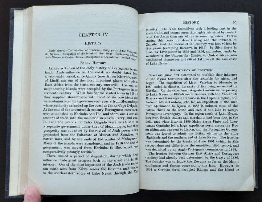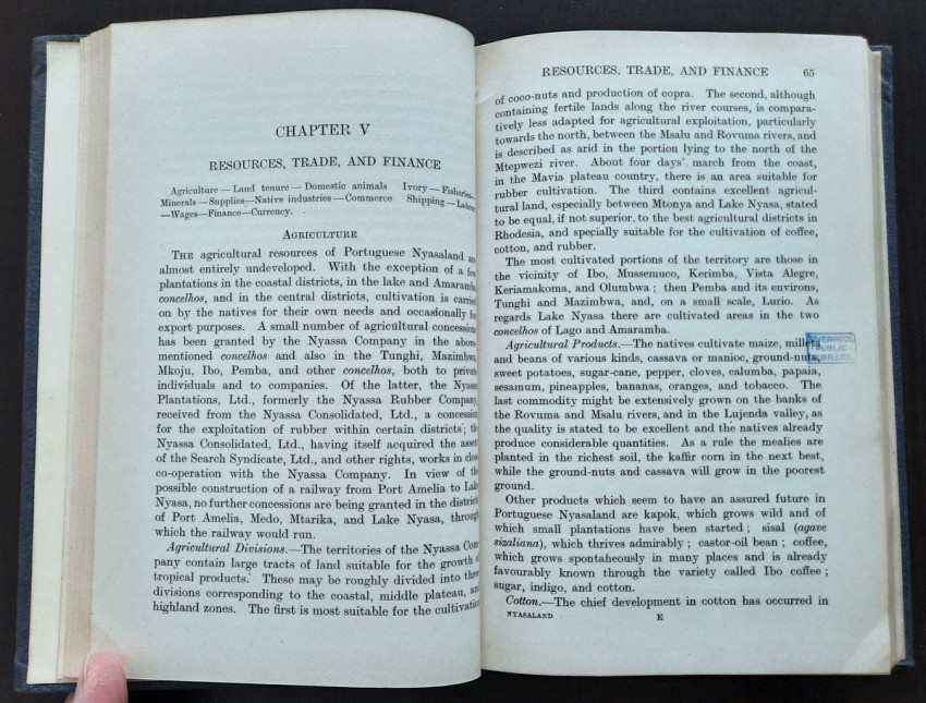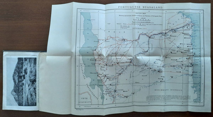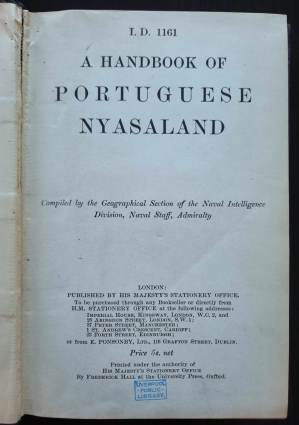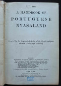 "[I.D. 1161]. A Handbook of Portuguese Nyasaland. Compiled by the Geographical Section of the Naval Intelligence Division, Naval staff, Admiralty."; Publisher's blue cloth covered hard boards. Gilt title to spine; Text in English; Collation complete – Title page, [9], 250 pages, with 12 photographic plates on 6 leaves, folding map, including Index; Ex-libris Liverpool Public Library with oval library blind stamp to both boards, white ink shelf number added to the spine and small blue ink stamp throughout, library label to the rear paste down. Binding is tight and firm, with usual shelf wear, little rubbed, extremities with some bumping. Spine tanned, a short cloth tear to the upper front and bottom rear joints. Otherwise joints and hinges are whole and secure. Boards little smudged and discolourated. Other than the library markings througout, pages/text block clean inside, with some age tanning to the white margins, no foxing or other markings throughout. Overall a very good copy.