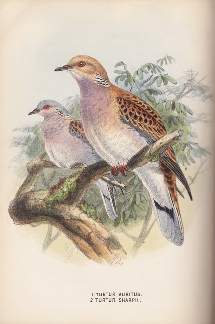 14 hand-coloured lithographic plates by Keulemans, an additional chromolithographic plates is tipped in at page 74, contemporary full limp leather, titled in gilt on the upper cover. The top corner of the text block is bumped but the contents and plate are in good condition, the leather is chipped at the top and bottom of the spine and is worn along the edges of the back and at the corners, the page edges are dust soiled.