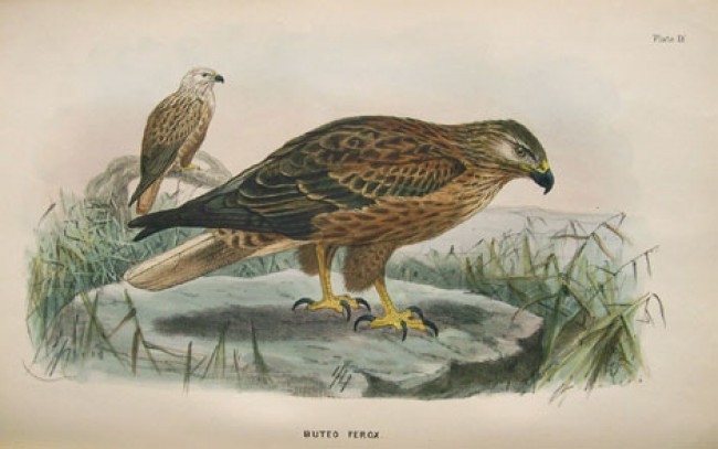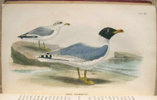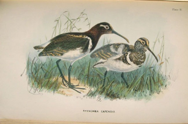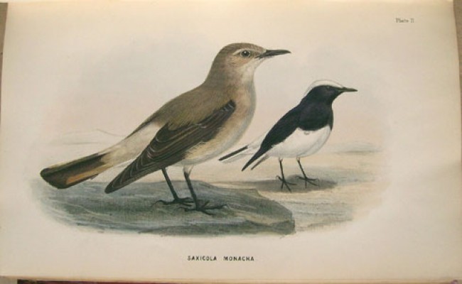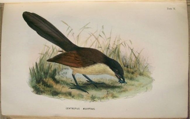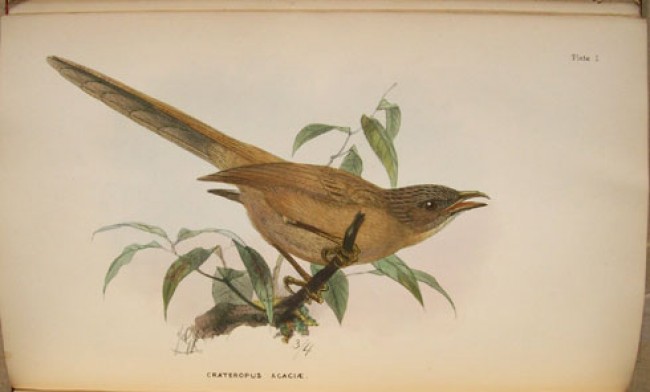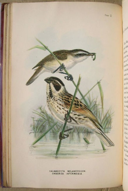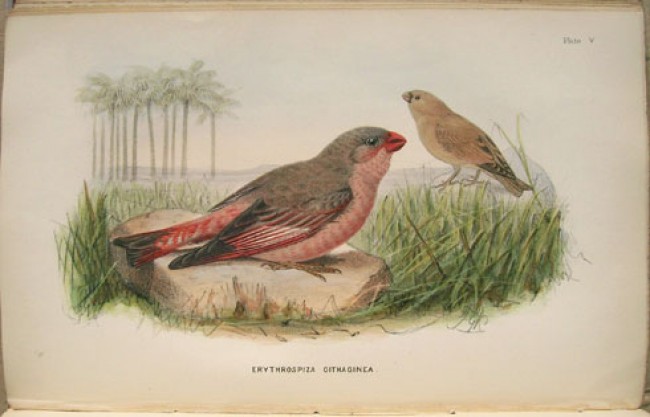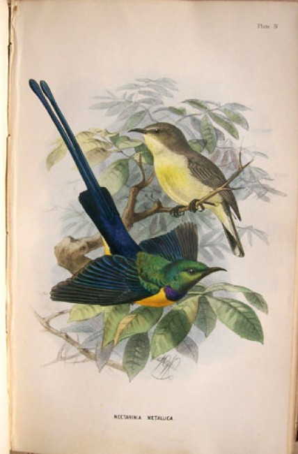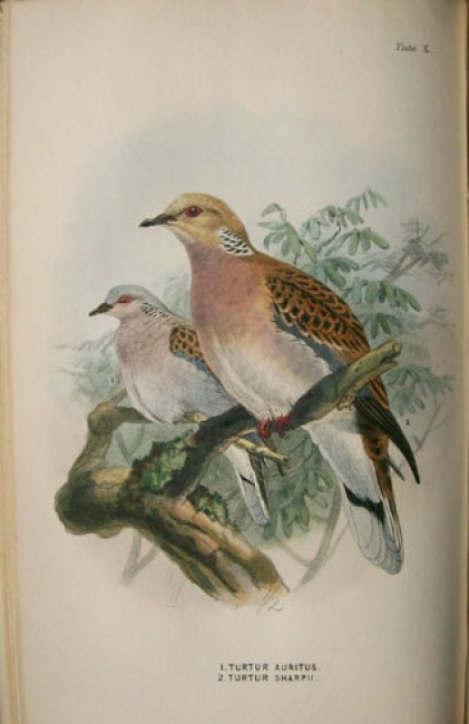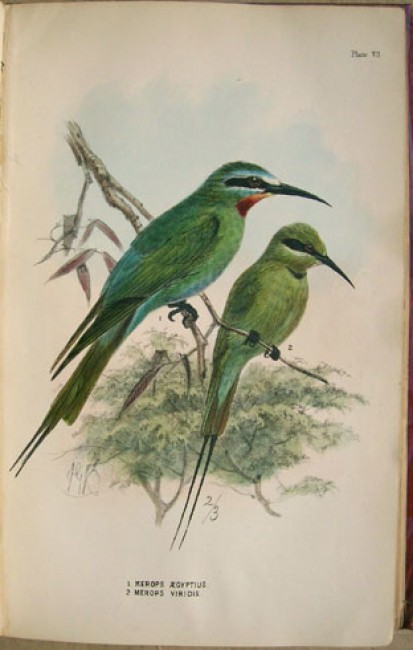 Original red cloth covered boards with gilt titling and a bird decorative device on the spine and blind stamped decorations on the boards. Black end papers. vii prelims, list of plates, 342 pages and 14 hand coloured plates by J.G. Keulemans.