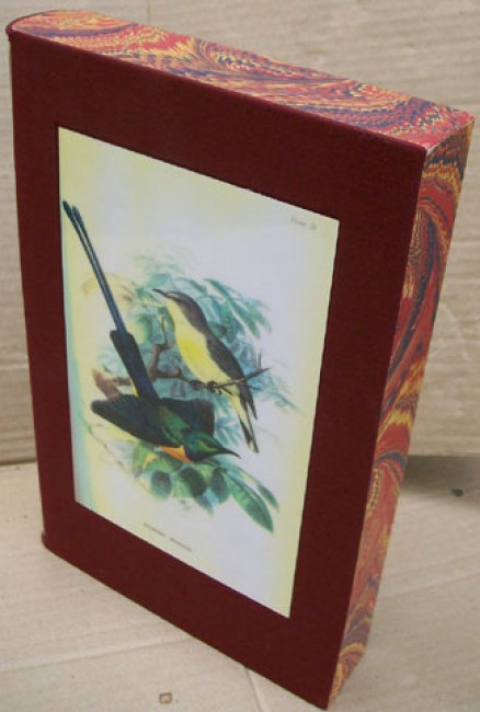 Housed in a custom built slip case made by master craftsman Peter Carstens covered with maroon coloured book cloth, hand marbled paper edges and leather trim.