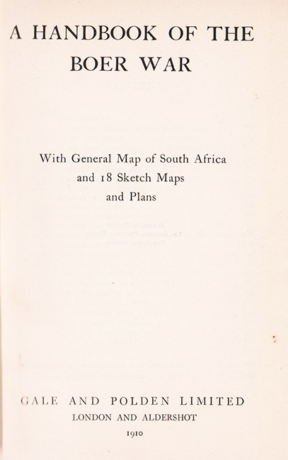 Prefatory Note: 'The author has endeavoured in this Handbook to compile for the use of students and others, a general account of the various phases of the Boer War of 1899 - 1902,