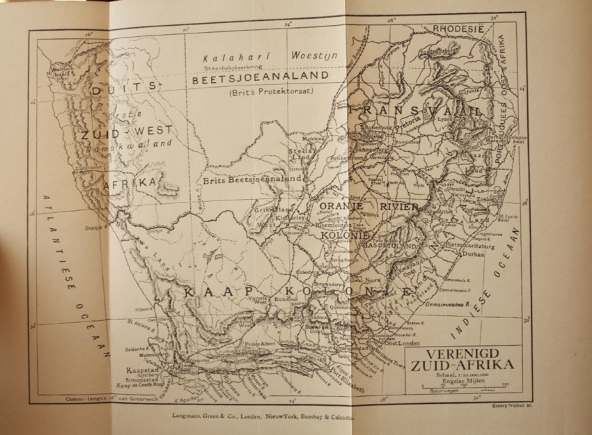 Publisher's tan cloth bindings with Union Jacks on the front boards. The English edition has 210pp and the Dutch has 195pp. The Dutch edition was translated from the English by Miss M. Le Roux. Five maps of which the first is a fold-out.