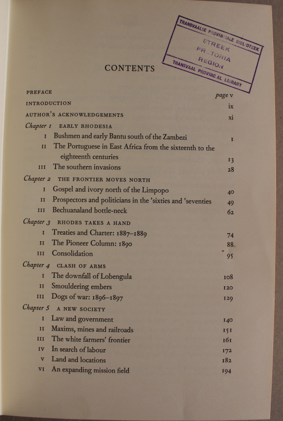 354 pages with fold-out map, in 8 chapters, e.g. Early Rhodesia, The Frontier Moves North, Rhodes, Downfall of Lobengula, White Rhodesia, mines & railroads, the Pioneer Column, etc...
