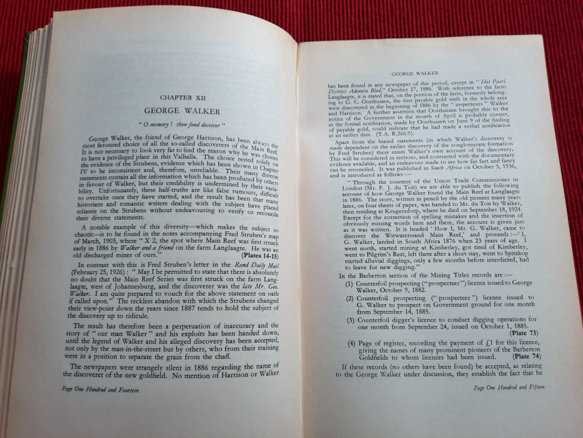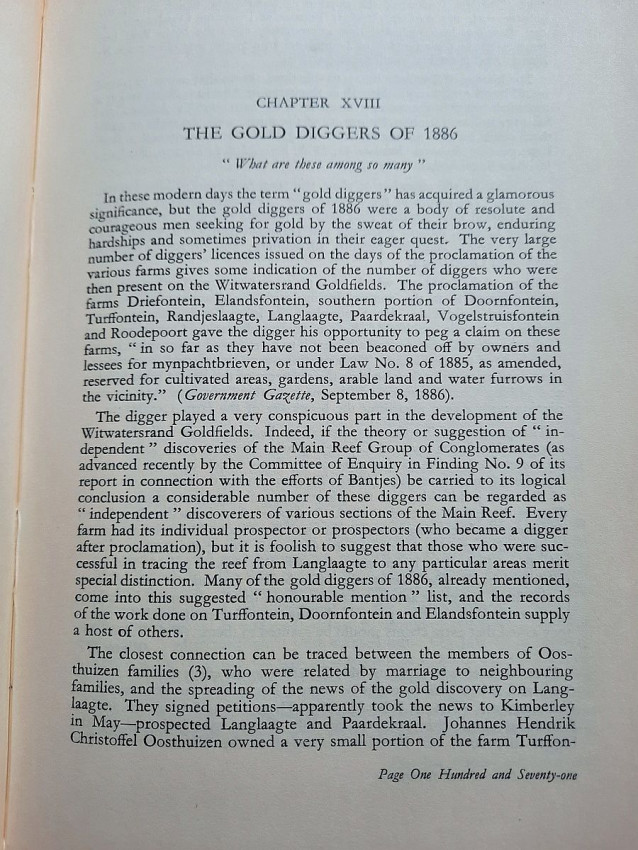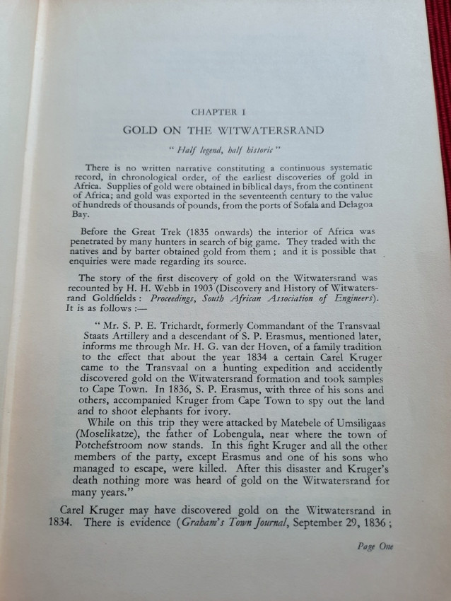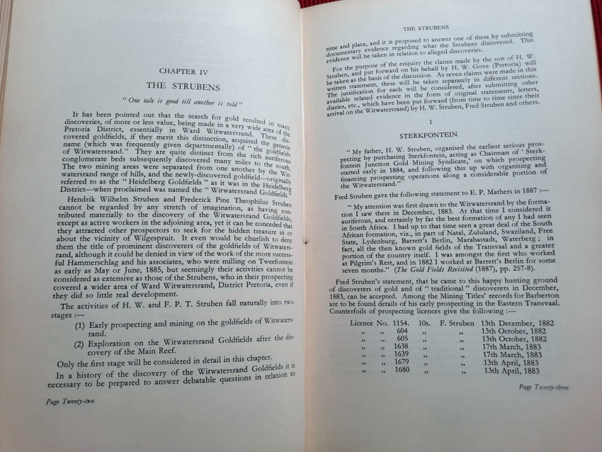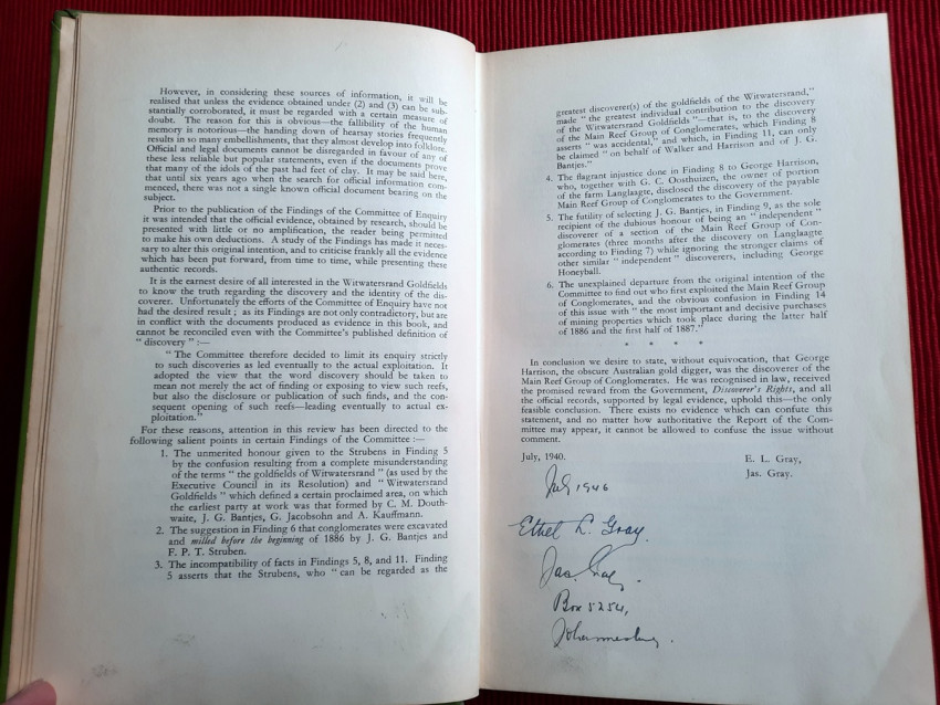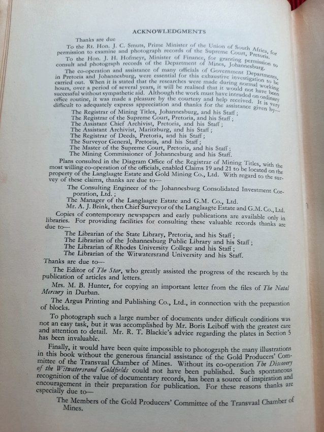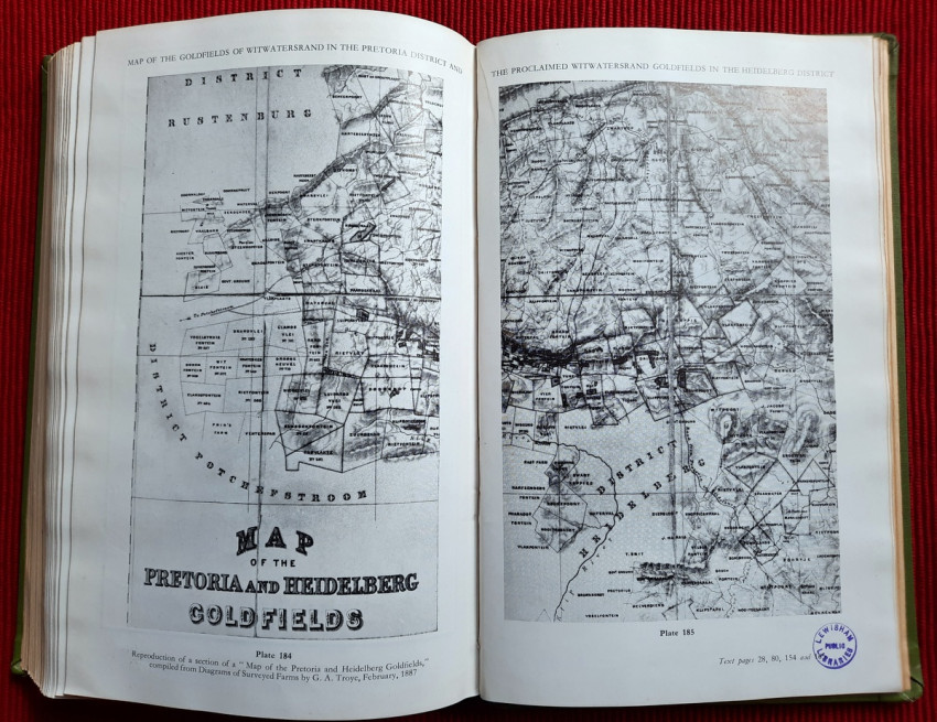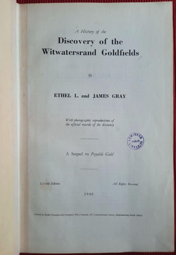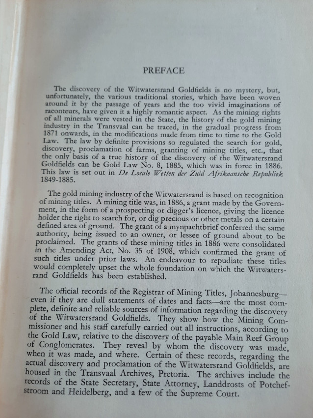 First edition (limited edition). Signed by Ethel L. Gray and Jas. Gray (date, signatures and place signed by pen at the end of the 'Preface'). This magnificent and detailed documentation about the earliest history of the discovery of the Witwatersrand gold fields contains all important facts, events and persons involved; including 159 pages of photos of documentary evidence with reproductions of official, legal and other documents (contracts, and agreements for gold mine properties, maps and sketches of possessions, registrations, licences, declarations, minutes, power of attorney's, letters, signatures of owners, diagrams, photographs, etc). Including the Reproduction of a section of a "Map of the Southern Transvaal showing the Outcrops of the Banket Formation", compiled by F. H. Hatch in 1895, to accompany "The Gold Mines of the Rand" by F. H. Hatch and J. A. Chalmers. Also including the Reproduction of a section of a "Map of the Pretoria and Heidelberg Goldfields compiled from Diagrams of Surveyed Farms", by G. A. Troye, February, 1887. This book is one of the most important reference works on Witwatersrand mining and gold mines.