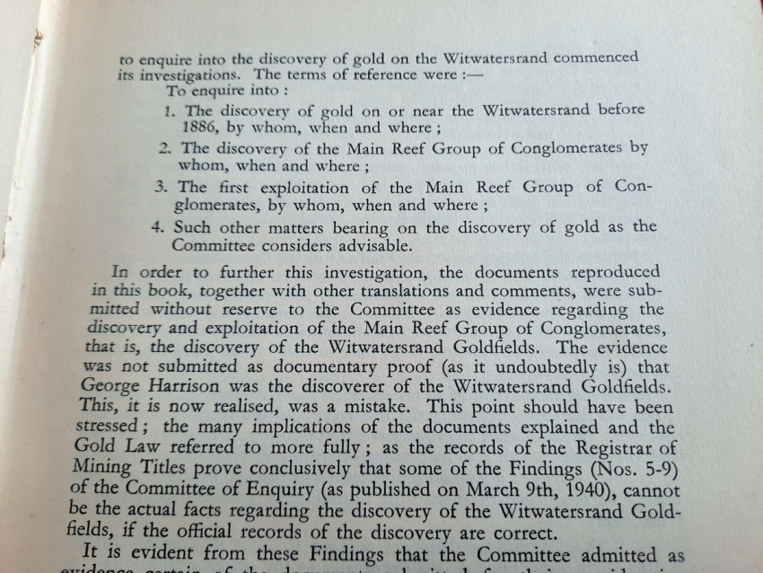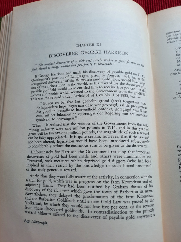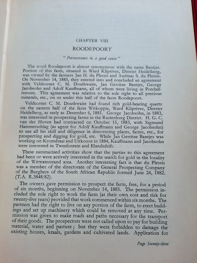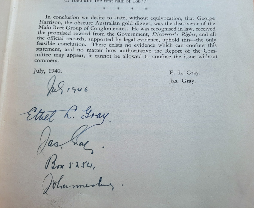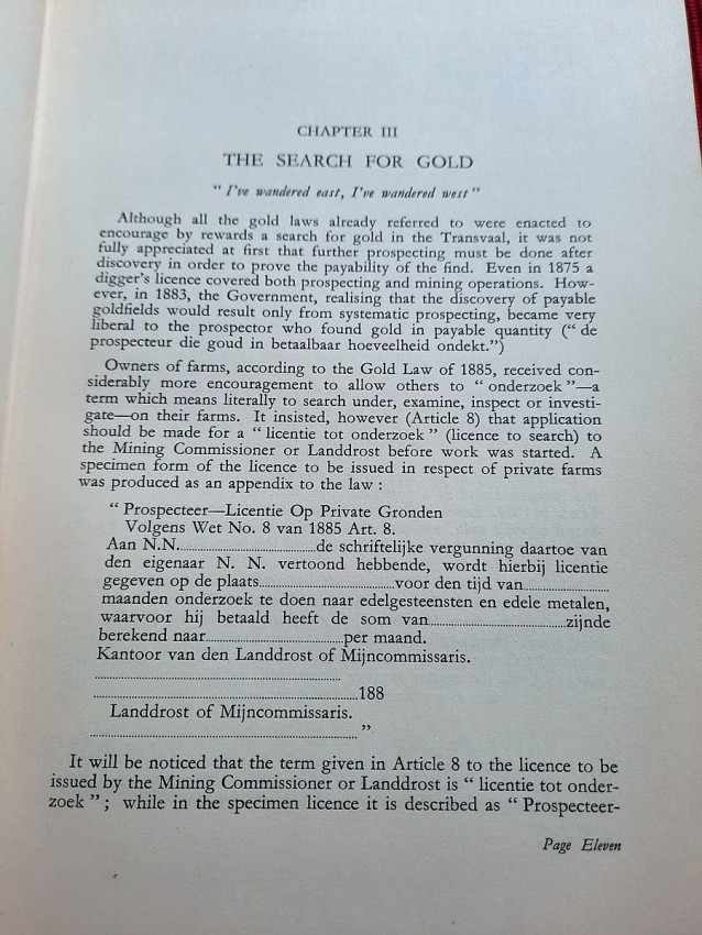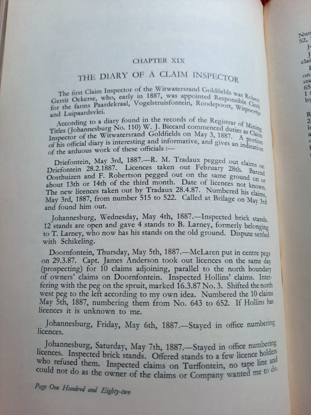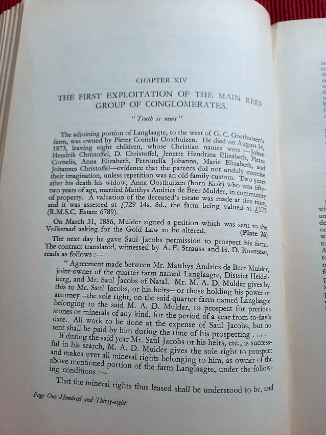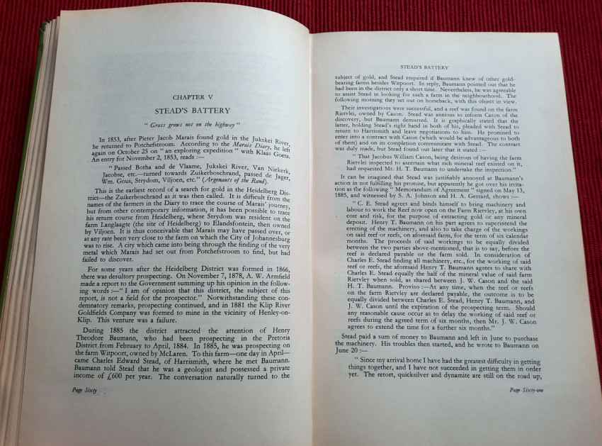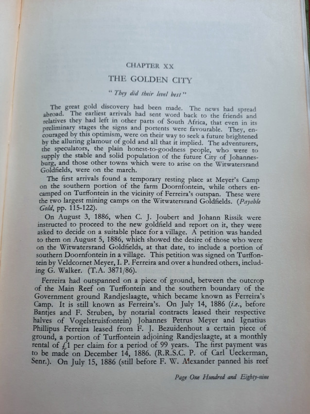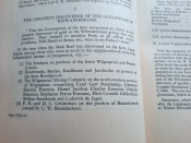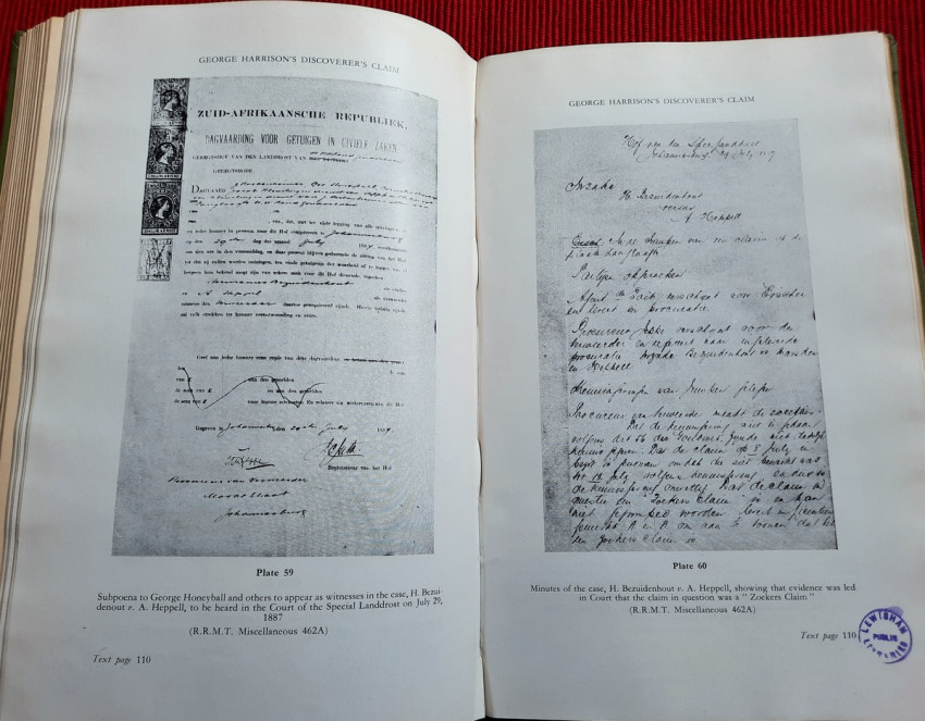 First edition (limited edition). Signed by Ethel L. Gray and Jas. Gray (date, signatures and place signed by pen at the end of the 'Preface'). This magnificent and detailed documentation about the earliest history of the discovery of the Witwatersrand gold fields contains all important facts, events and persons involved; including 159 pages of photos of documentary evidence with reproductions of official, legal and other documents (contracts, and agreements for gold mine properties, maps and sketches of possessions, registrations, licences, declarations, minutes, power of attorney's, letters, signatures of owners, diagrams, photographs, etc). Including the Reproduction of a section of a "Map of the Southern Transvaal showing the Outcrops of the Banket Formation", compiled by F. H. Hatch in 1895, to accompany "The Gold Mines of the Rand" by F. H. Hatch and J. A. Chalmers. Also including the Reproduction of a section of a "Map of the Pretoria and Heidelberg Goldfields compiled from Diagrams of Surveyed Farms", by G. A. Troye, February, 1887. This book is one of the most important reference works on Witwatersrand mining and gold mines.
