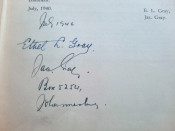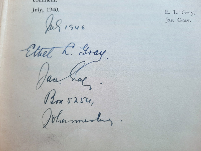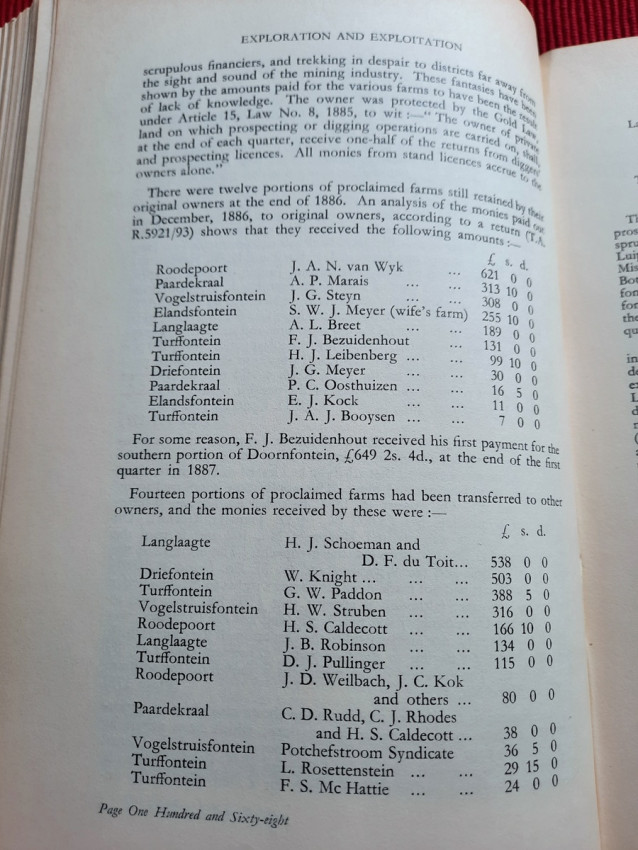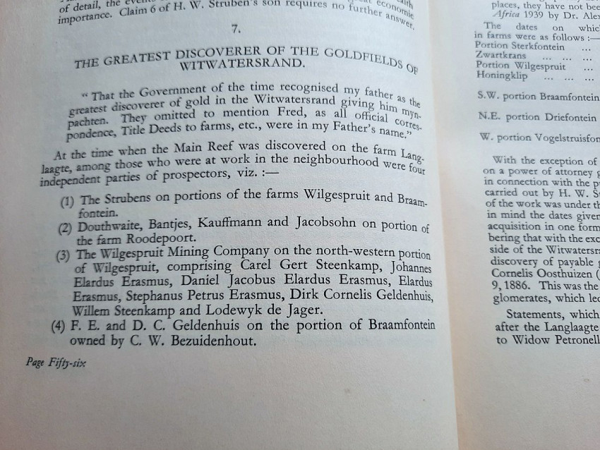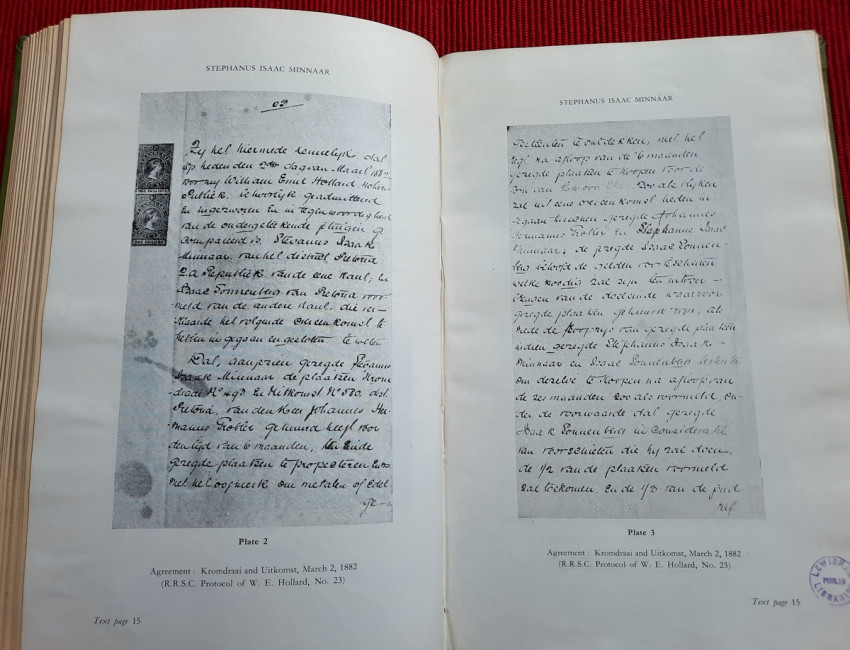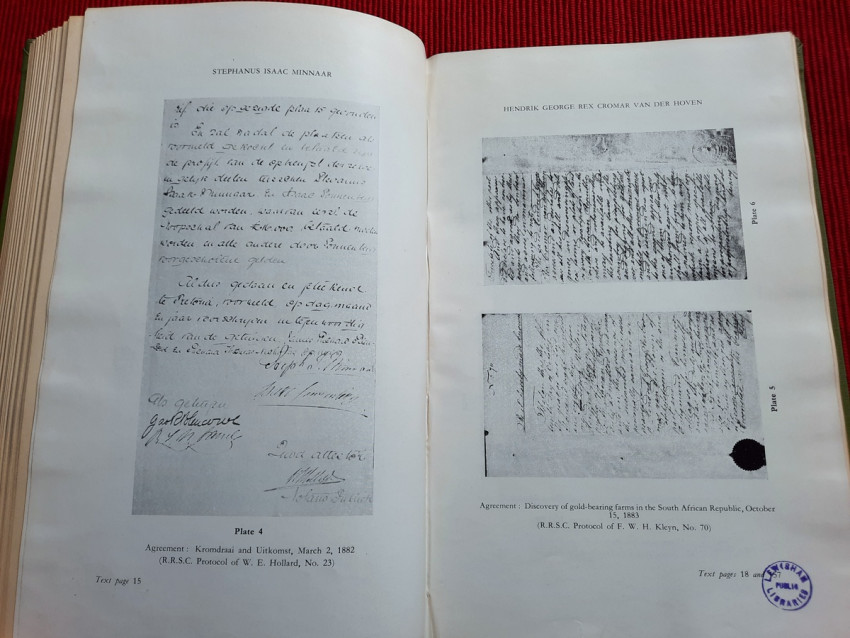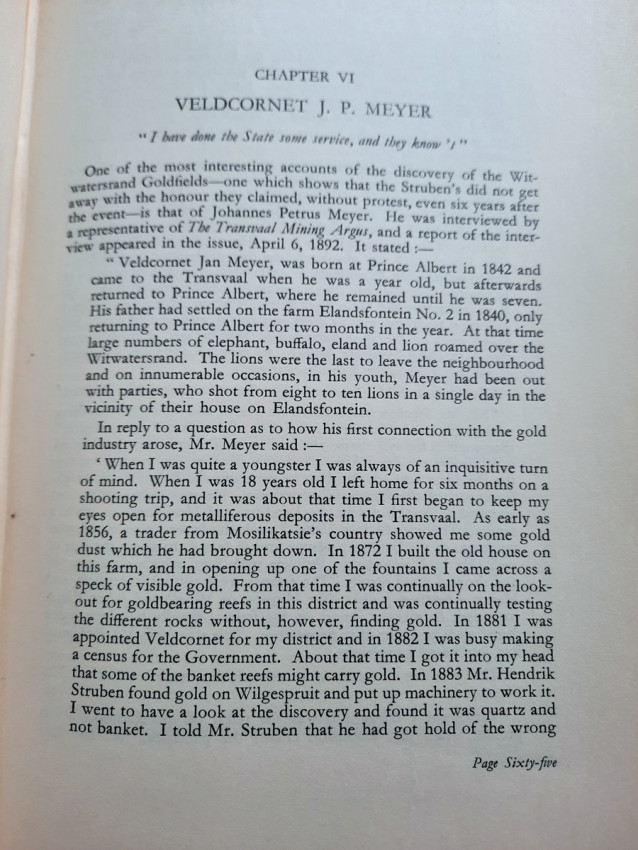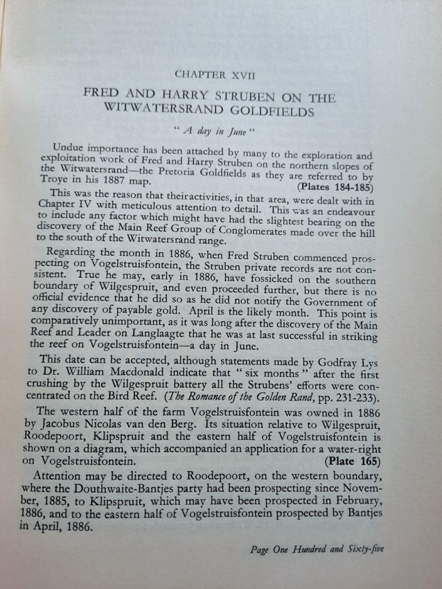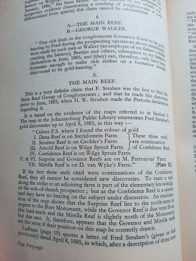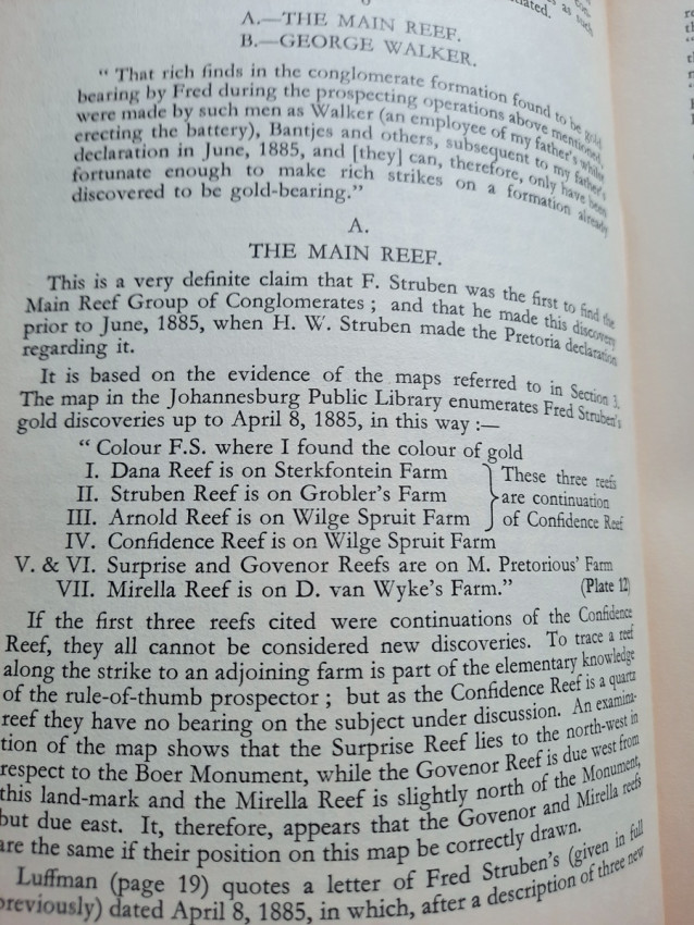 First edition (limited edition). Signed by Ethel L. Gray and Jas. Gray (date, signatures and place signed by pen at the end of the 'Preface'). This magnificent and detailed documentation about the earliest history of the discovery of the Witwatersrand gold fields contains all important facts, events and persons involved; including 159 pages of photos of documentary evidence with reproductions of official, legal and other documents (contracts, and agreements for gold mine properties, maps and sketches of possessions, registrations, licences, declarations, minutes, power of attorney's, letters, signatures of owners, diagrams, photographs, etc). Including the Reproduction of a section of a "Map of the Southern Transvaal showing the Outcrops of the Banket Formation", compiled by F. H. Hatch in 1895, to accompany "The Gold Mines of the Rand" by F. H. Hatch and J. A. Chalmers. Also including the Reproduction of a section of a "Map of the Pretoria and Heidelberg Goldfields compiled from Diagrams of Surveyed Farms", by G. A. Troye, February, 1887. This book is one of the most important reference works on Witwatersrand mining and gold mines.