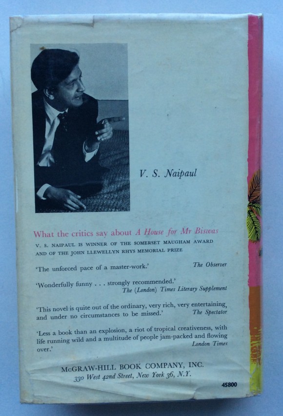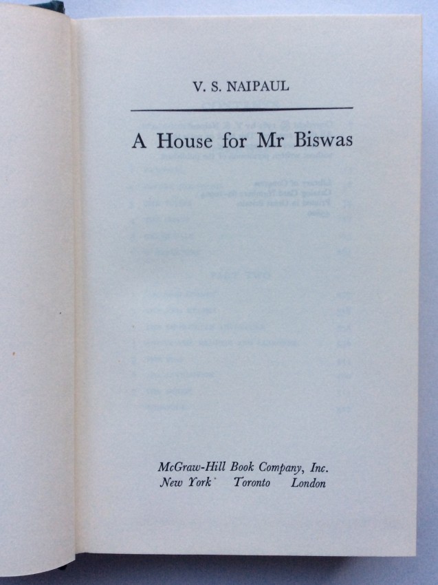 A House for Mr Biswas. New York, [etc.]: [printed in Great Britain for] McGraw-Hill Book Company, 1961. 8vo., pp. [1-] 531.