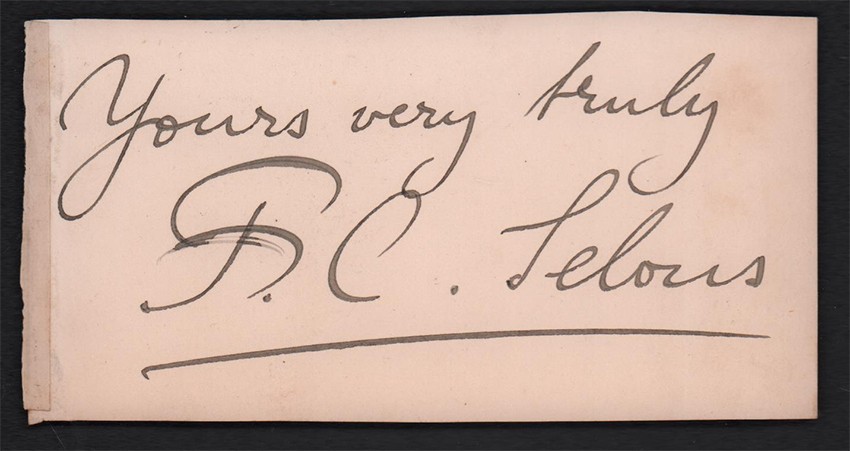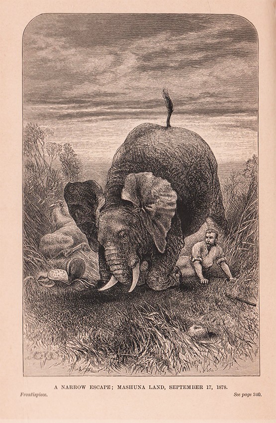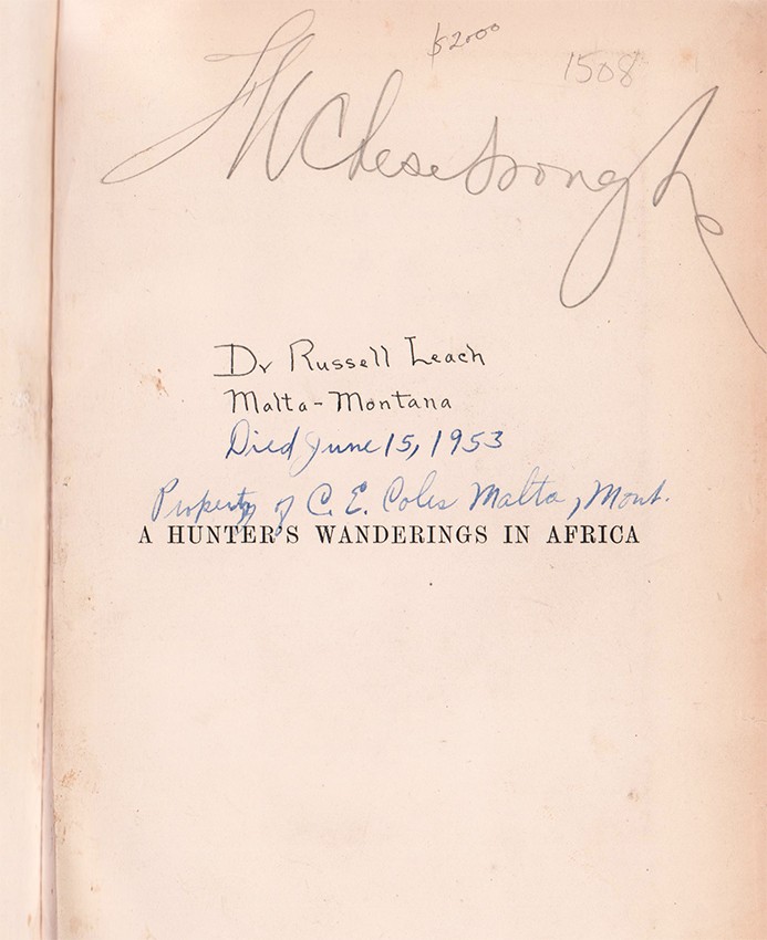 Second Edition: 455 pages, wood engraved frontispiece "A narrow escape; Mashuna Land, September 17, 1878", folding map, 18 engraved plates, original green cloth recased, the three antelope heads stamped in gold on the upper cover, titled gilt on the spine, uncut edges, mark on the black front paste down end paper, inscriptions of previous owners on the half title page, contents bright, a very good copy. A card with an inscription in Selous’s hand is loosely inserted – ‘Yours very truly, F.C. Selous.’
