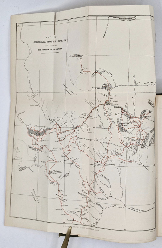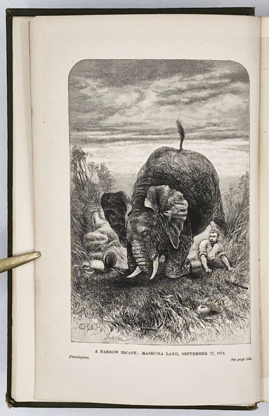 First Edition: 455 pages, wood engraved frontispiece - 'A narrow escape; Mashuna Land, September 17, 1878,' folding map with minor repair with tape at the first fold, 17 engraved plates, original green cloth with the three antelope heads stamped in gold on the upper cover laid down, titled and gilt decoration on the spine, uncut edges, leaf 271/2 repaired in the gutter with tape, section 277/284 loose, binding split at pages 160/161and simply repaired, contents very good.