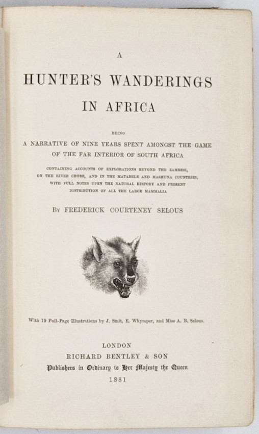 Czech (Dr Kenneth) An Annotated Bibliography of African Big Game Hunting Books 1785 to 1999, page 251: ‘One of the most often reprinted African big game book titles, the first four are the most sought after. Selous travelled through Bechuanaland and Matabeleland with numerous hunting episodes after lion, black rhino, buffalo and elephant particularly in the Linquasi Valley. In the second half of the book he trekked across the Zambesi with a long hunt for elephant in Mashonaland. Throughout the text are descriptions of a wide variety of game bagged including hippo, sable, kudu. Eland and other antelope species. A true classic of the African sporting field.’