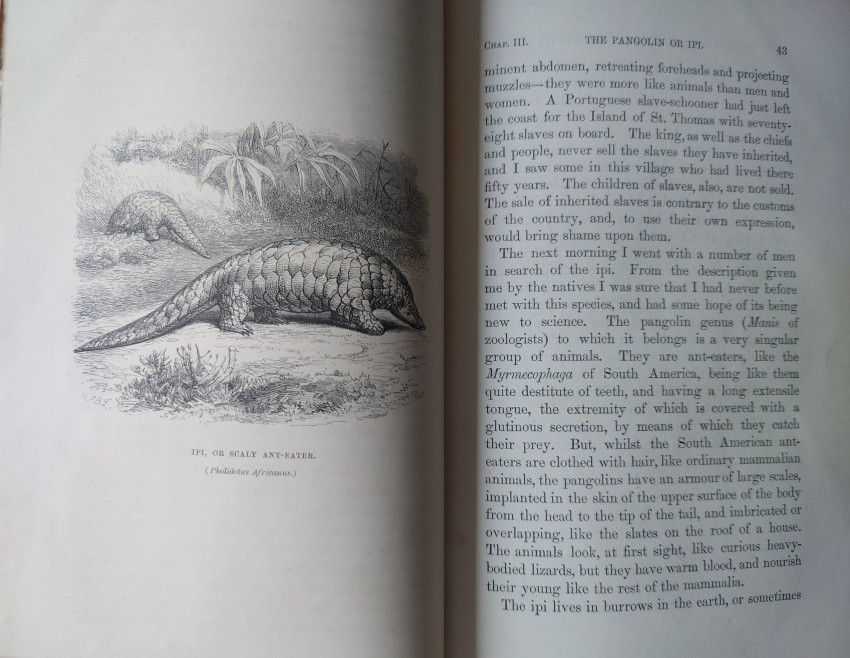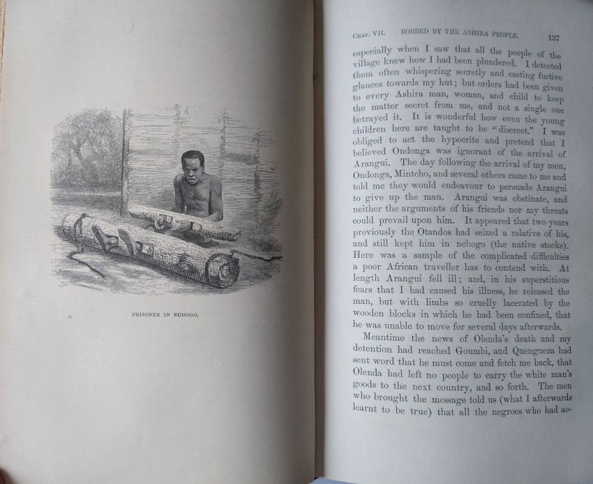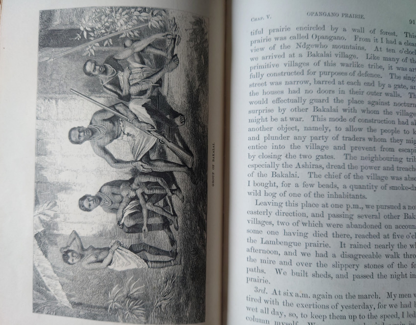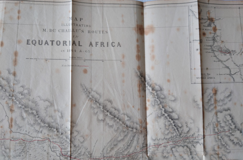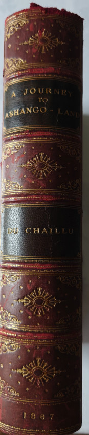 Written by Paul du Chaillu, a French-American traveller.Two pages of publisher's adverts to the rear. In a half leather cloth binding with raised bands to the spine. Gilt. Externally, generally smart. A little bumping to the head and tail of the spine and to the extremities. A few minor marks to the boards. Internally, firmly bound. Pages are bright and clean. Map heavily spotted.
