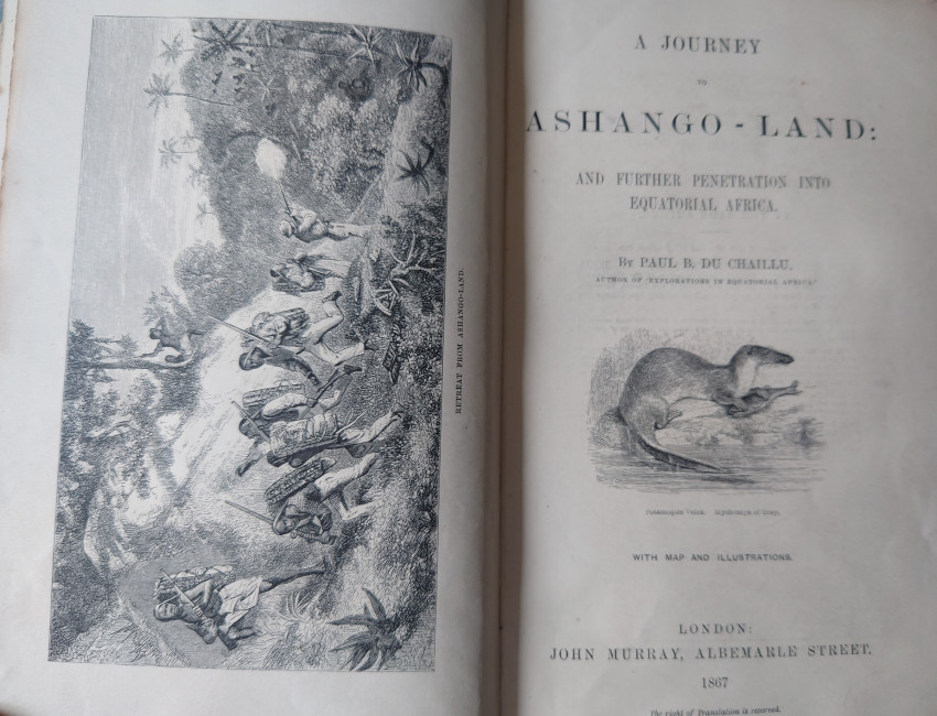 Published by John Murray, 1867. 1st edition. A superior copy of this first edition of du Chaillus' travel account of his time in Equatorial Africa, illustrated with a folding map and 21 plates. The first edition of this work.'A Journey to Ashango-Land' is du Chaillu's first hand account of his time in Ashango Land and Equatorial Africa.Whilst du Chaillu was researching this book, he was elected the King of the Apingi tribe.Illustrated with a frontispiece, vignette title page, one folding map, and twenty-one plates.
