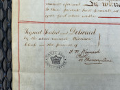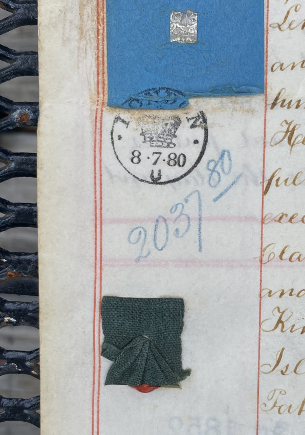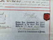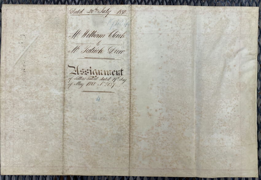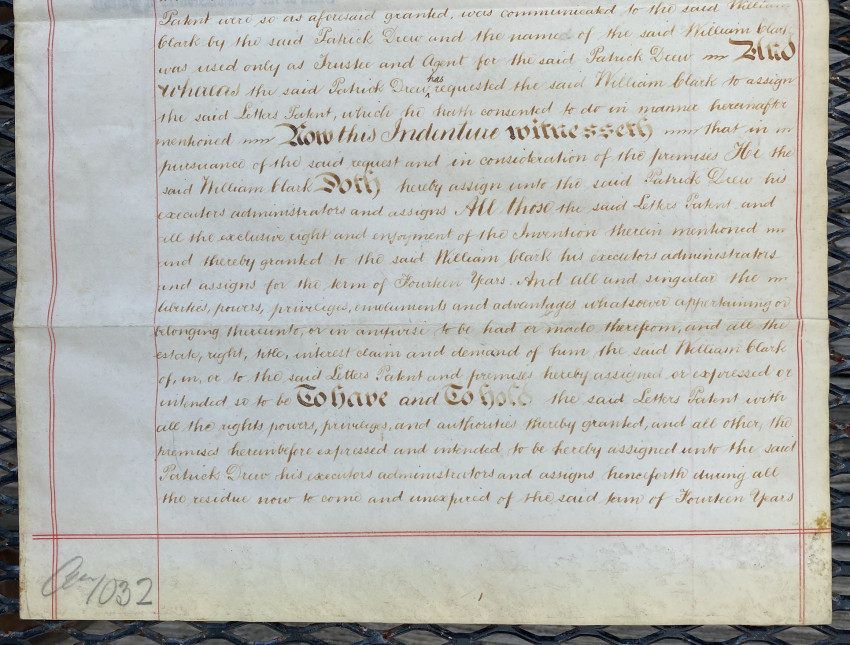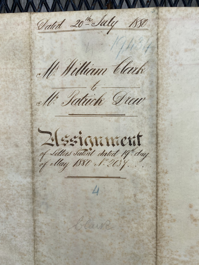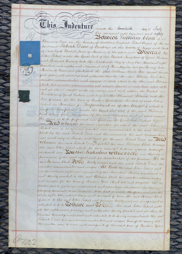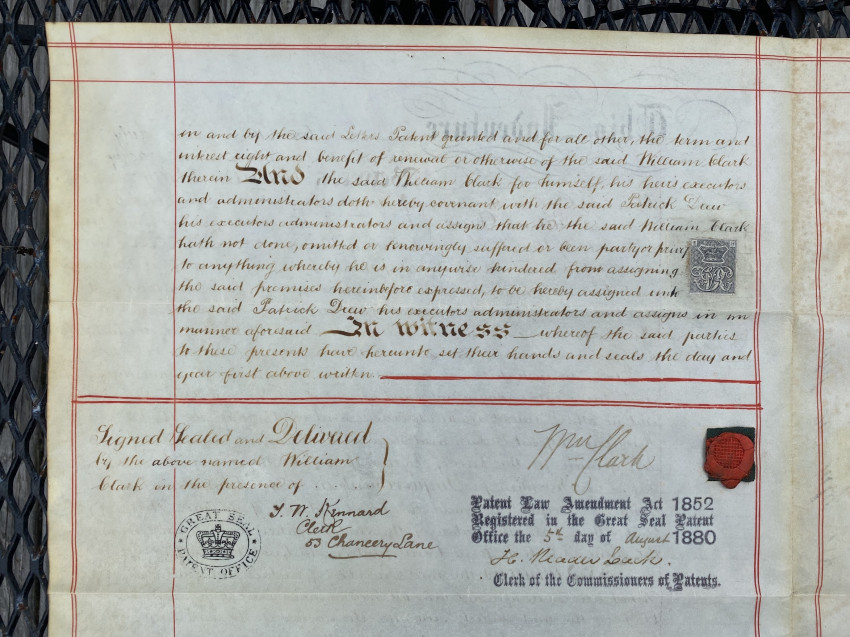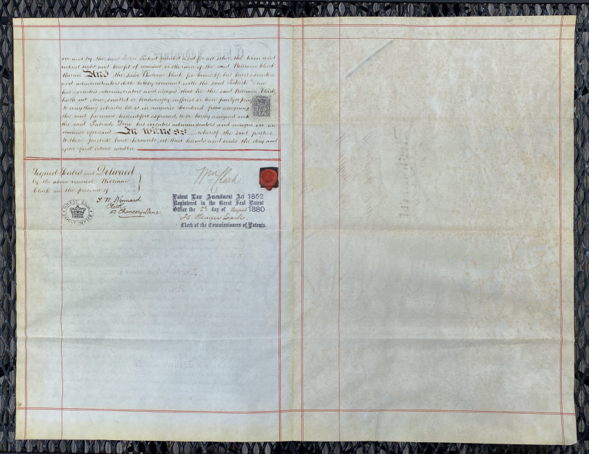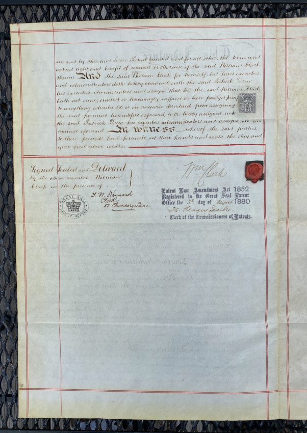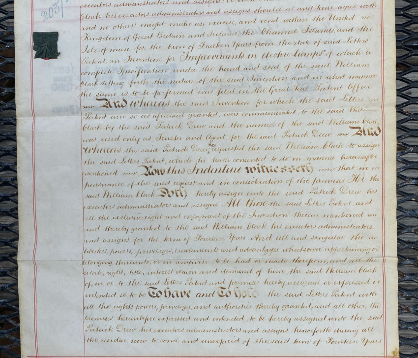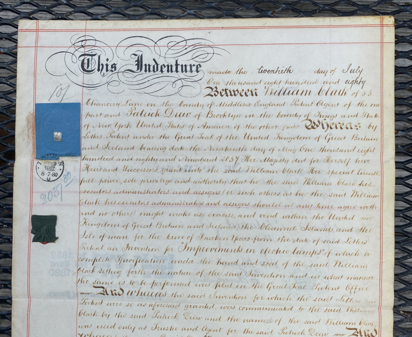 A manuscript document on vellum, being a re-assignment of the patent rights granted for ‘an Invention for “Improvements in the electric lamps”’, dated London, 20th July 1880, from William Clark to Patrick Drew, vellum, bifolium (18 ½ x 12 ¼ in; 470 x 311mm), ruled with red margin markers, blue duty stamp, signed and sealed on the second page, the third blank, docketed on the final page ‘Dated 20th July 1880 / Mr William Clark / to / Mr Patrick Drew / Assignment / of Letters Patent dated 19th day / of May 1880[Patent] No. 2037.