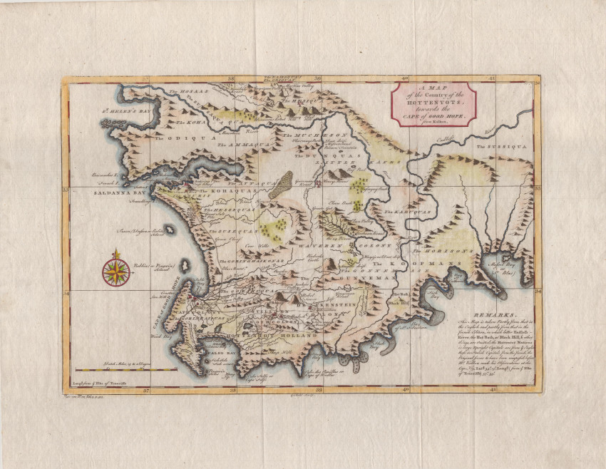 This is an uncommonly available 1746, English map of the Cape of Good Hope, which was based on the popular French map by Nicolas Bellin (c.1747), but also from a scare, similar English map that was published in Peter Kolb & Mr. Medley. The Present State of the Cape of Good Hope. (London: W. Innys, 1731; London: W. Innys & R Manby, 1738). Although Bellin is attributed on the map, his map (and the map in Medley's book) is after the map by Peter Kolbe(1727) who closely copied the map by Francois Valentyn (1726).