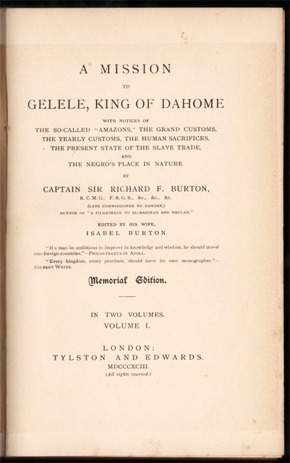 With notices of The So-Called \"Amazons,\" The Grand Customs, The Yearly Customs, The Human Sacrifices, The Present State of the Slave Trade, and The Negro\'s Place in Nature. Edited by his wife Isabel Burton.