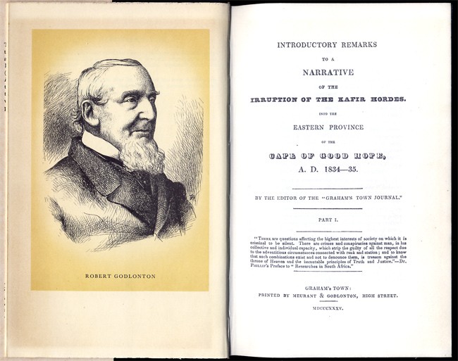 \\\'Godlonton\\\'s Narrative is described in Mendelssohn\\\'s Bibliography as \"an account of the Kaffir Wars of 1834-35 compiled from articles…[in] the Graham\\\'s Town Journal, official reports and dispatches, the author\\\'s personal knowledge of the incidents of the campaign, and from information received by him from Sir Harry Smith and his Officers .\" There is a comprehensive account of the settlers\\\' case, and of their difficulties in the frontier districts, as well as an Appendix which records figures of settlers\\\' losses and other contemporary data. This is an essential and invaluable source book of the period.\\\' Editor\\\'s note.