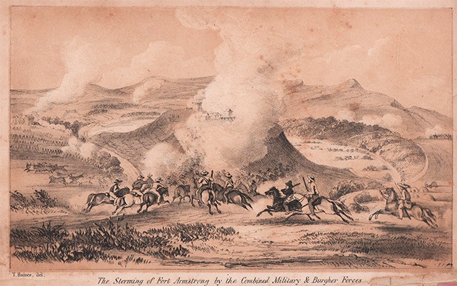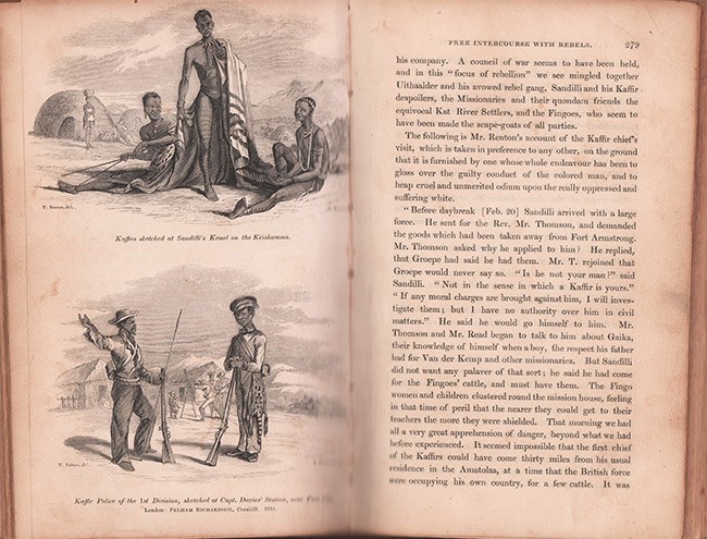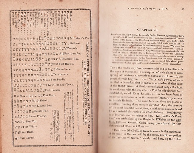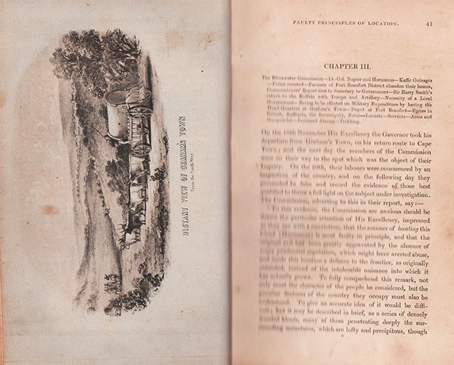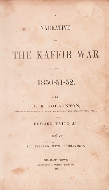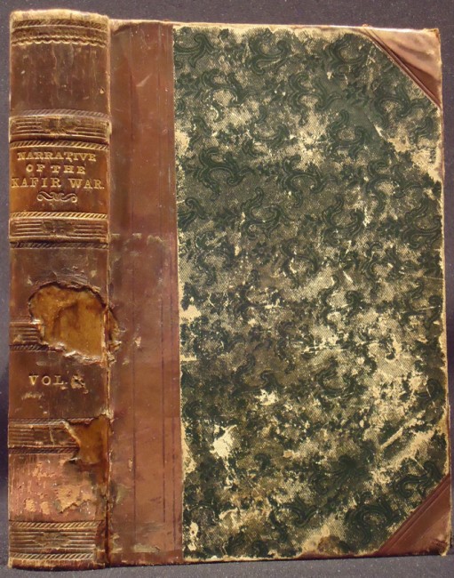vii + 511 pages, lithographic frontispiece after Thomas Baines, 5 engraved plates, table (Table of reciprocal distances of principal military posts, ports, Etc. on Eastern Frontier), diagram, half brown leather with marbled boards, scuffed and worn, title gilt on spine, simply repaired on the spine, frontispiece loose, adhesive label removed from the front paste down end endpaper, pages 76-78 incorrectly bound, light soiling and foxing and some pence under lining, housed in a brown cloth solander box with black title label on spine